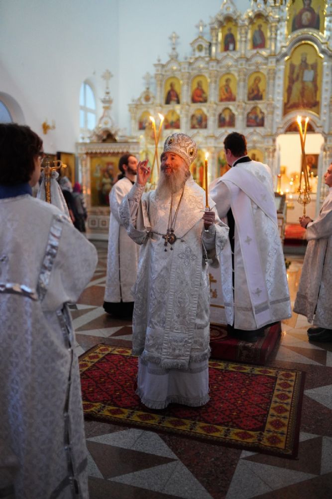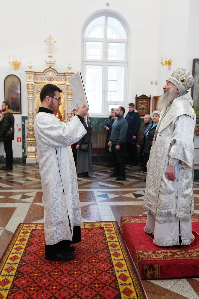 Его Высокопреосвященству сослужили клирики собора иереи Леонид Вылекжанин, Андрей Кочаков, Игорь Коваль и диакон Алексий Кузнецов. Песнопения исполнял хор собора под управлением регента Алисы Вылегжаниной.