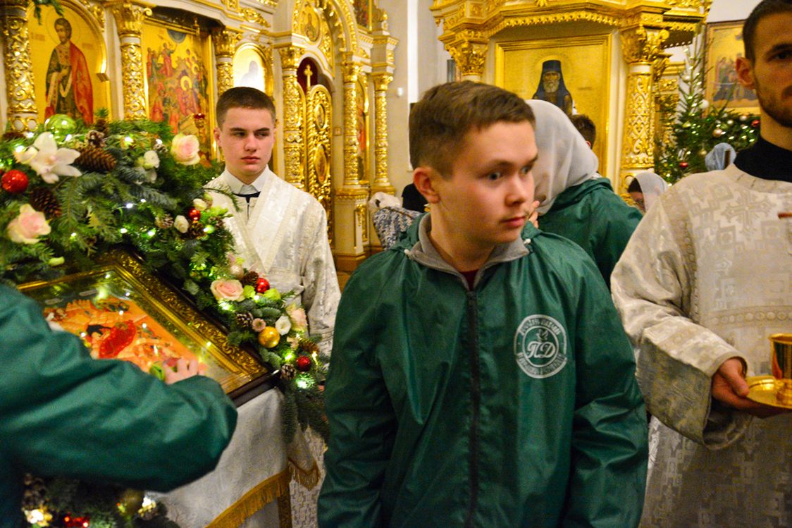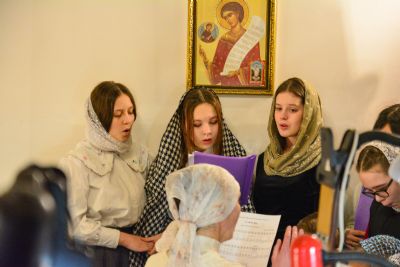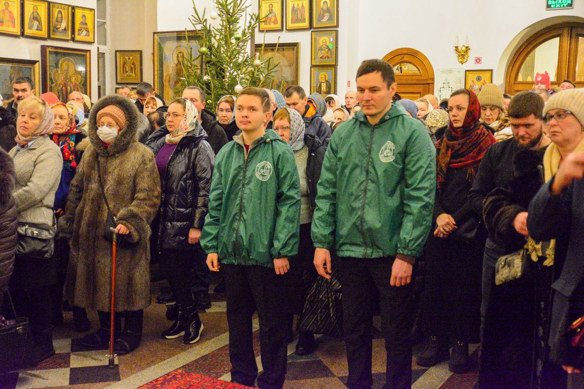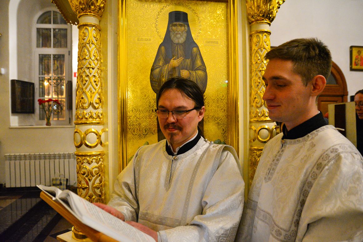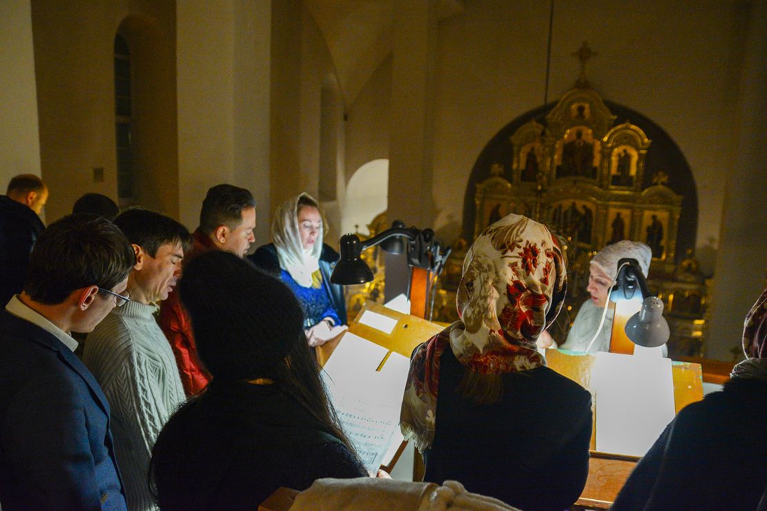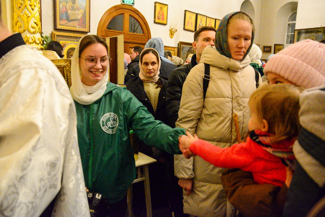 Владыке сослужили настоятель храма иерей Александр Лоскутов, клирики храма иереи Никита Смирнов, Димитрий Дьяков, Евгений Симаков, Сергий Иванов и диакон Димитрий Кудряшов, а также протодиакон Михаил Козловский. Песнопения исполняли антифонно два состава хора храма под руководством регента Наталии Поповой.