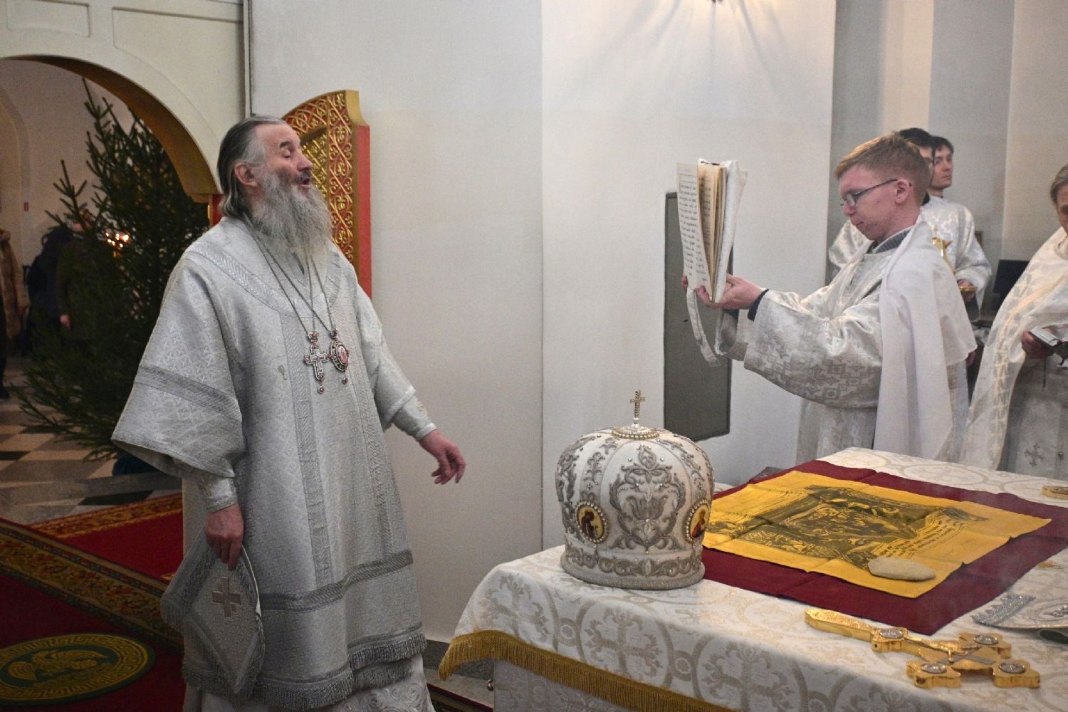 Его Высокопреосвященству сослужили настоятель храма протоиерей Александр Бачурин, клирики храма протоиерей Василий Лихачев, иереи Константин Домрачев, Виктор Умрихин, Николай Бабич, Феодор Ромашов и диакон Алексий Ершов, а также протодиакон Михаил Козловский. Пел хор храма под управлением регента Елены Умрихиной.