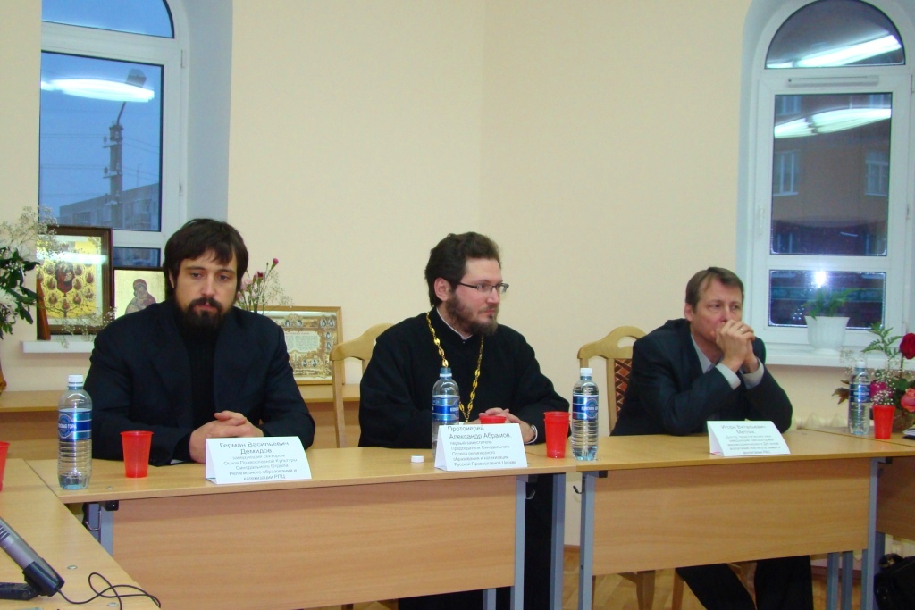 Наша республика с недавнего времени включена в состав регионов, где в школах экспериментально вводится изучение предмета «Основы православной культуры». Это вызвало в обществе полемику, внести ясность в которую в нашу епархию прибыли гости из Москвы: первый заместитель Председателя Синодального отдела религиозного образования и катехизации РПЦ протоиерей Александр Абрамов, заведующий лабораторией мировоззренческих и духовно-нравственных основ воспитания Института семьи и воспитания Игорь Витальевич Метлик и заведующий сектором Основ православной культуры Синодального отдела религиозного образования и катехизации РПЦ Герман Васильевич Демидов.