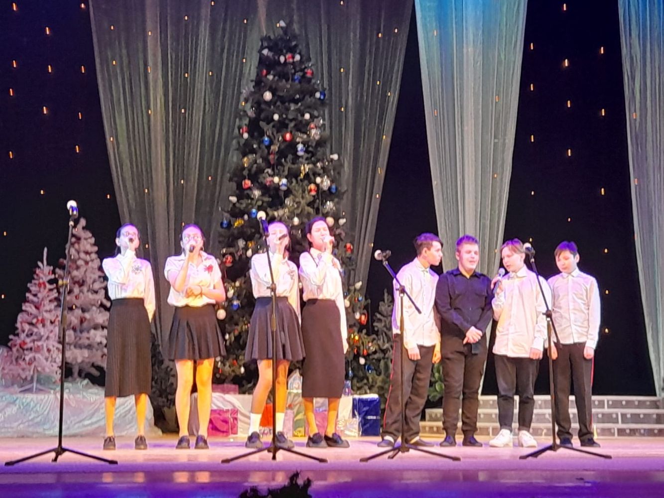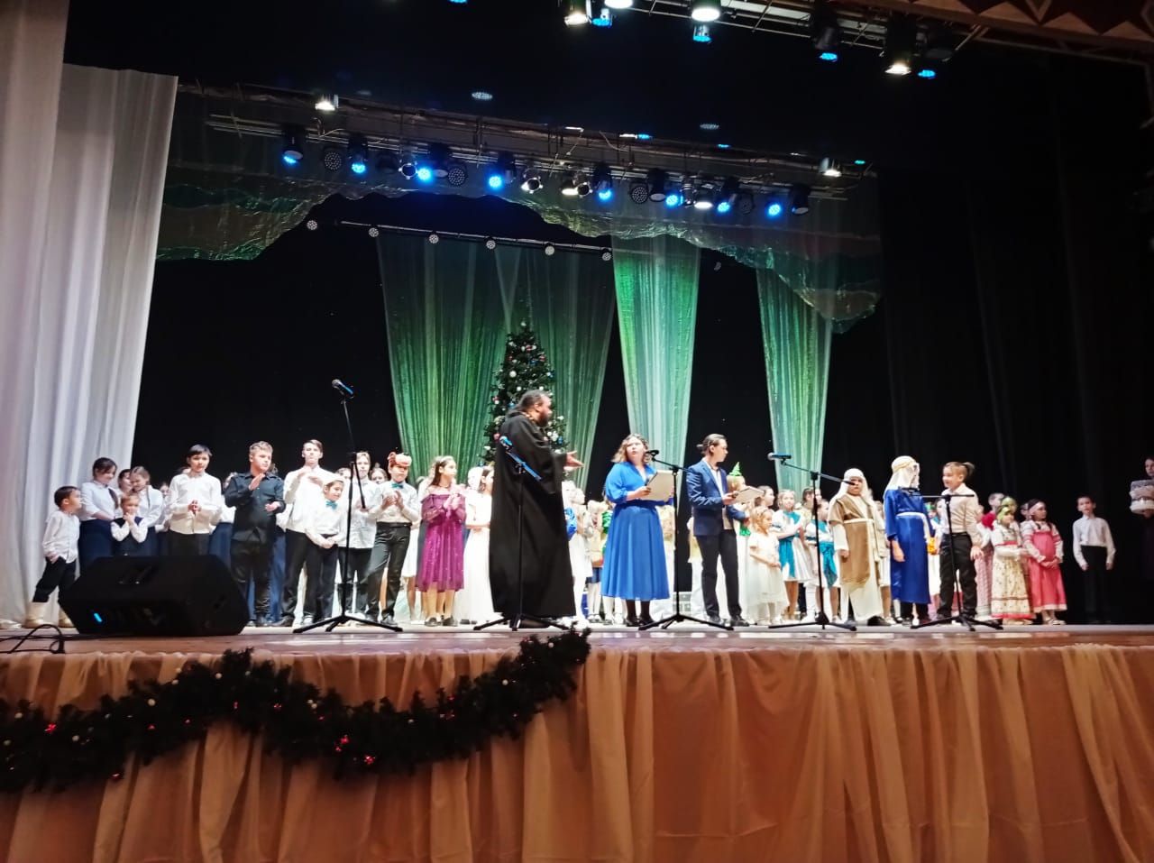В зрительном зале собрались дети и взрослые. Приглушенный свет, блеск рождественских украшений и сияние красавицы-елки – все создавало по-настоящему сказочное настроение! Со сцены проникновенно зазвучали слова песни «Ночь спускается на землю…» в исполнении воспитанников воскресной школы при храме Святой Троицы г. Козьмодемьянска, и зрители погрузились в праздничную атмосферу Рождества Христова.