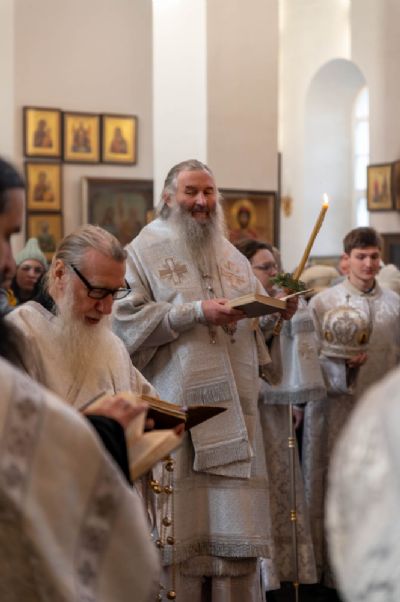 Его Высокопреосвященству сослужили секретарь Йошкар-Олинского епархиального управления иеромонах Серафим (Пасанаев), настоятель храма иерей Александр Лоскутов, клирик храма иерей Никита Смирнов и протодиакон Михаил Козловский. Песнопения исполнял хор храма под управлением регента Наталии Поповой.