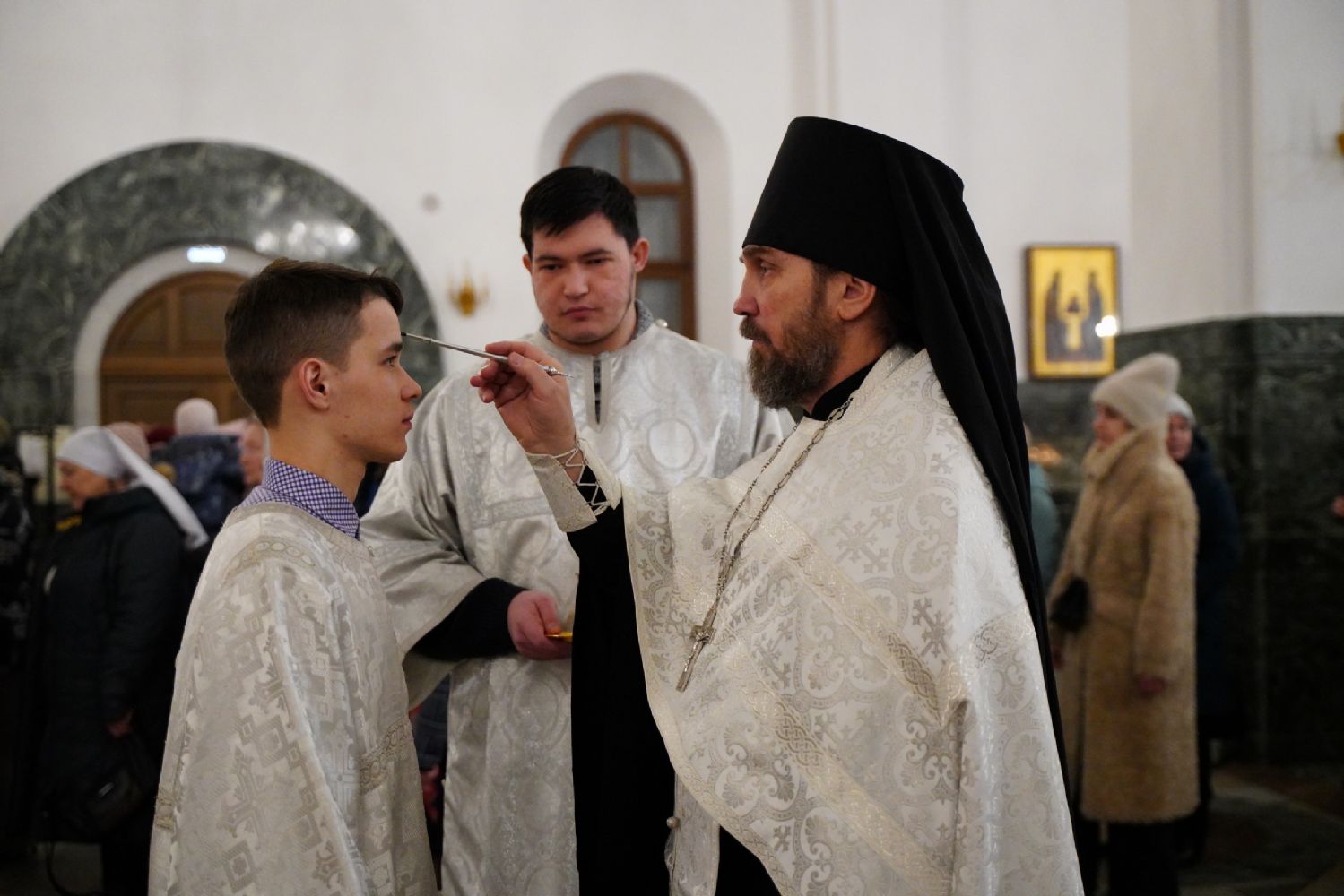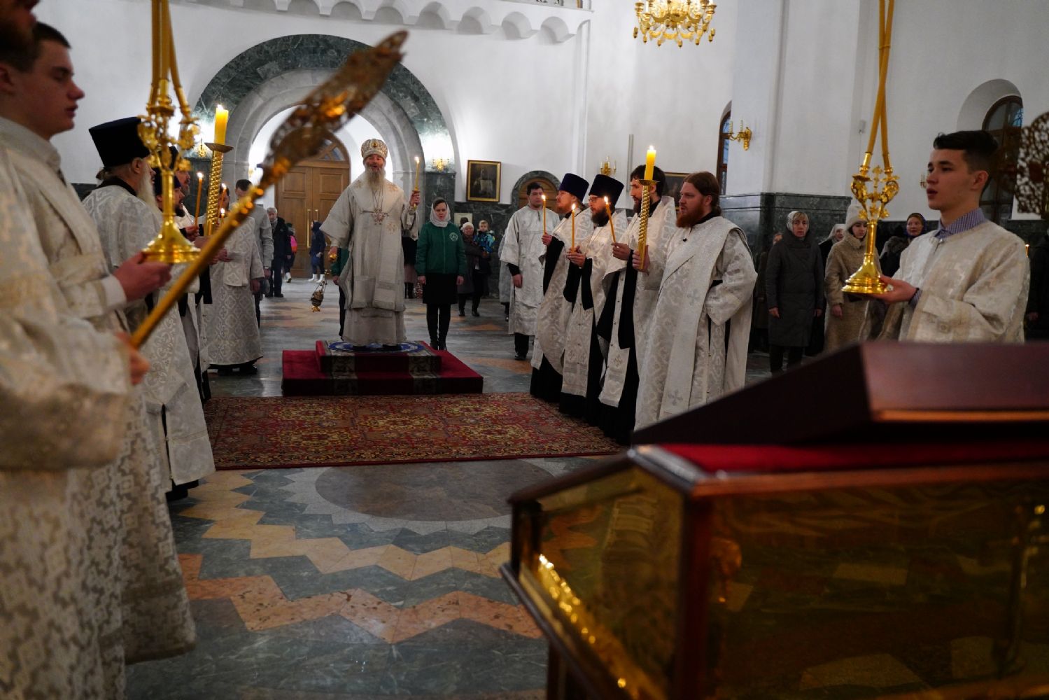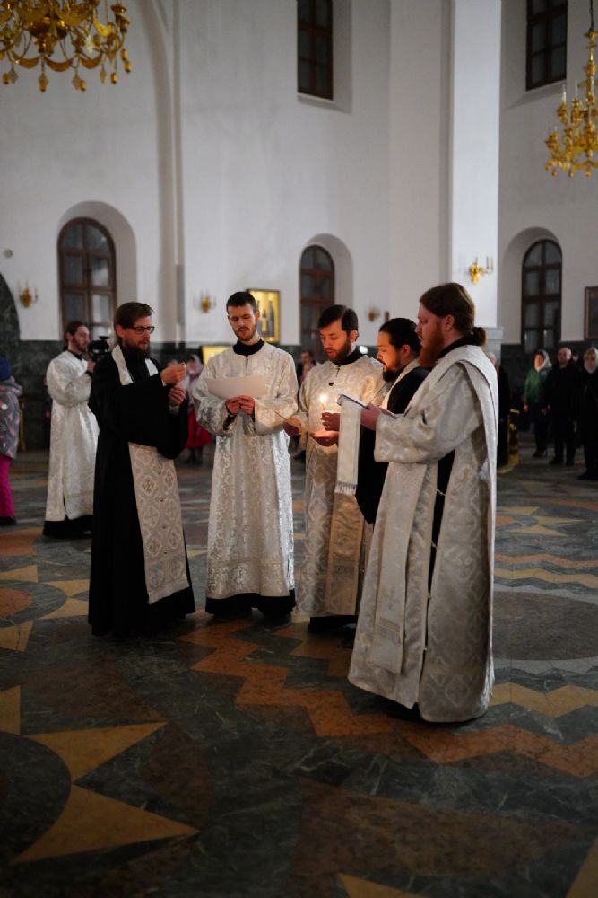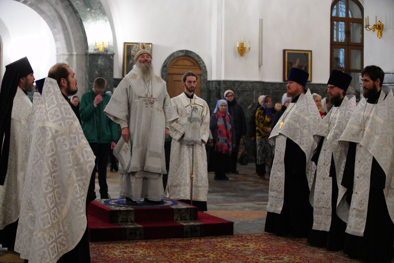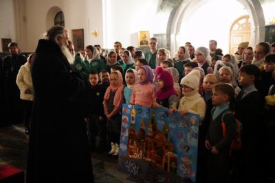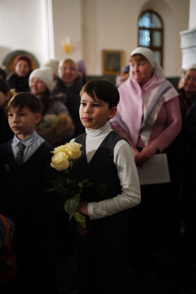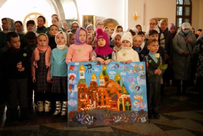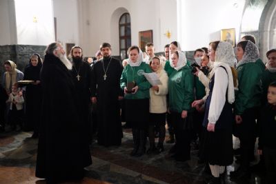 Его Высокопреосвященству сослужили секретарь Йошкар-Олинского епархиального управления иеромонах Серафим (Пасанаев), ключарь собора протоиерей Сергий Поглазов, клирики собора и протодиакон Михаил Козловский. Пел детско-юношеский хор «Благовест» под управлением регента Татьяны Черновой.