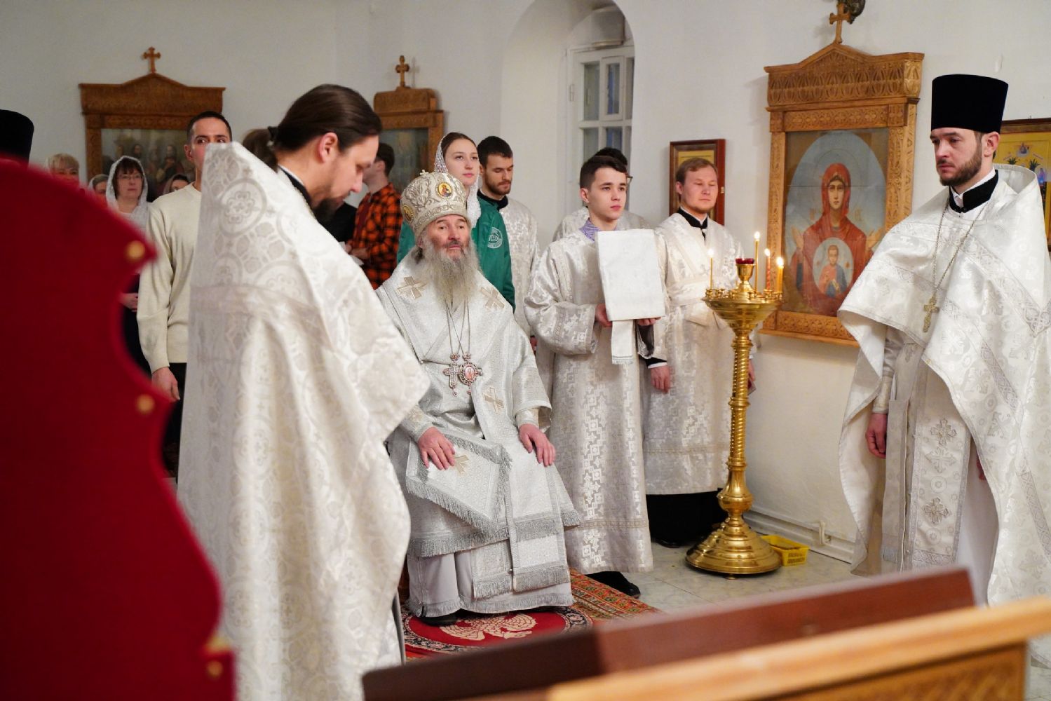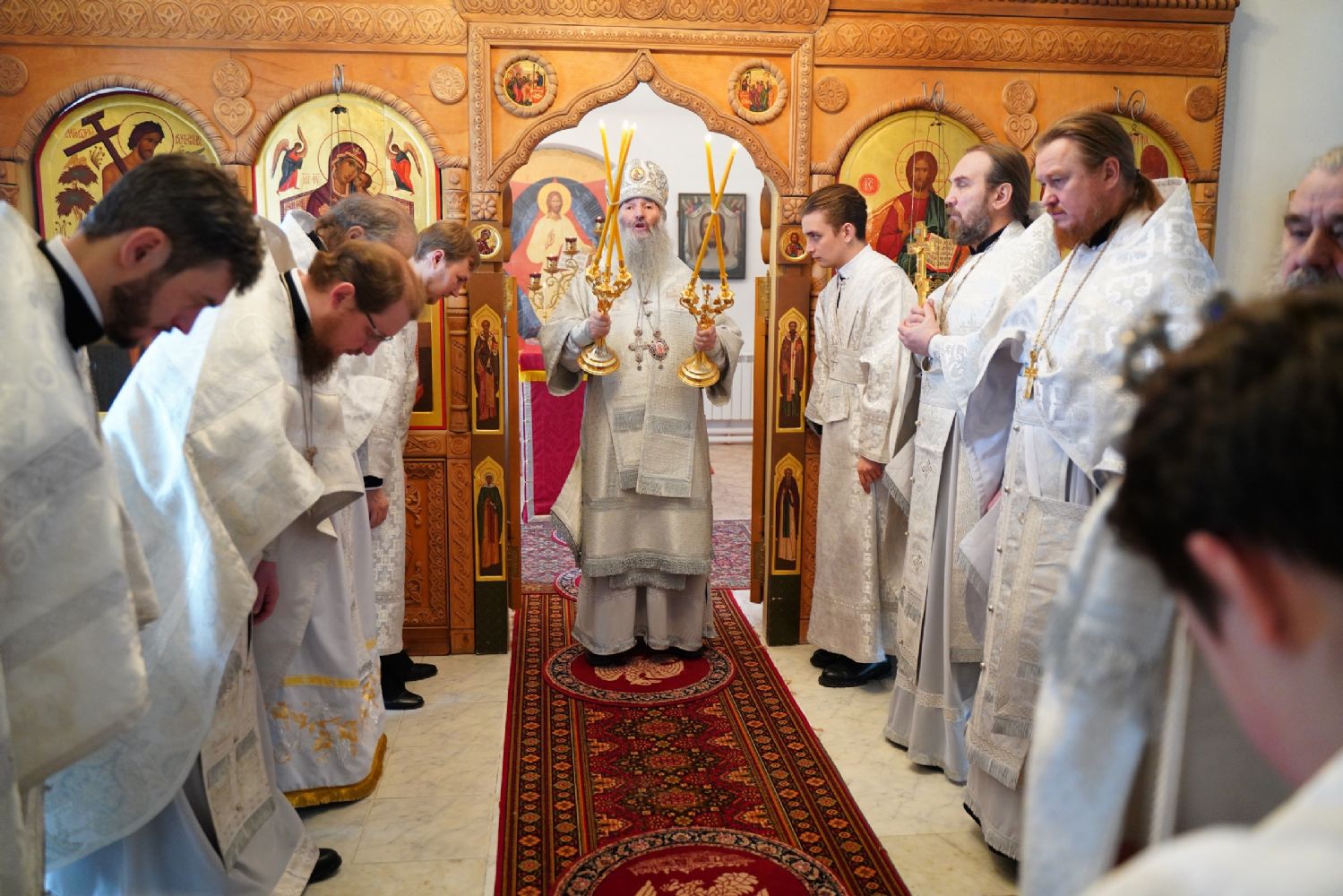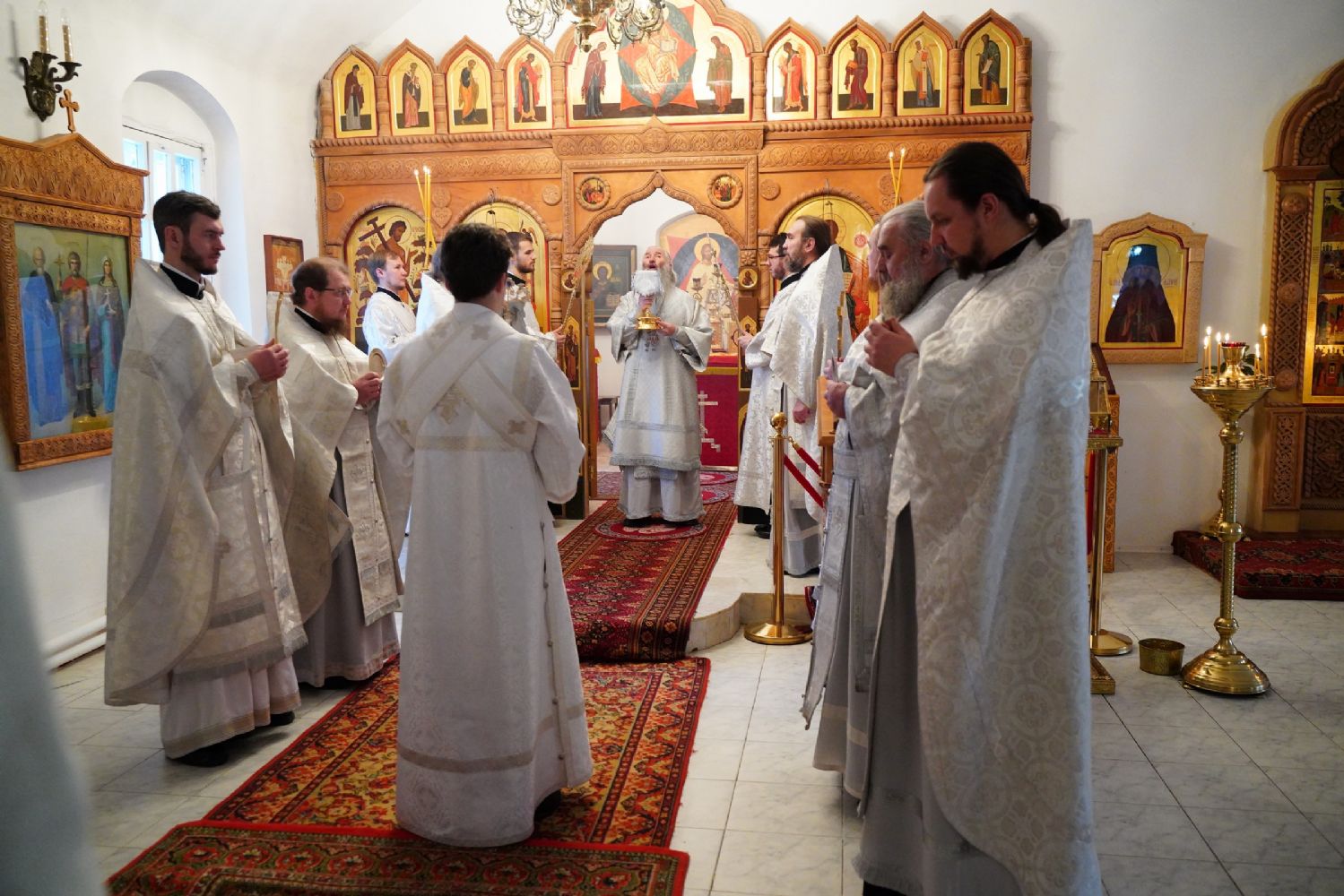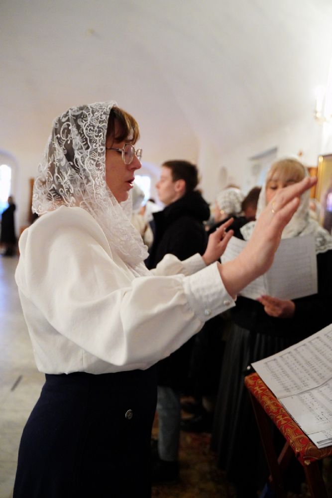 Архипастырю сослужили секретарь Йошкар-Олинского епархиального управления иеромонах Серафим (Пасанаев), ключарь Благовещенского кафедрального собора протоиерей Сергий Поглазов и клирик собора Диакон Андрей Дружинин, клирик Мироносицкого монастыря иерей Михаил Лежнин, клирик Воскресенского собора г. Йошкар-Олы иерей Игорь Коваль и протодиакон Михаил Козловский, а также священнослужители из-за пределов Марийской епархии, приехавшие поздравить владыку Иоанна с 65-летием. Песнопения исполняли два хора: «Благовест» под руководством регента Татьяны Черновой, хор Троицкого храма г. Йошкар-Олы под руководством регента Анны Ярошевич.