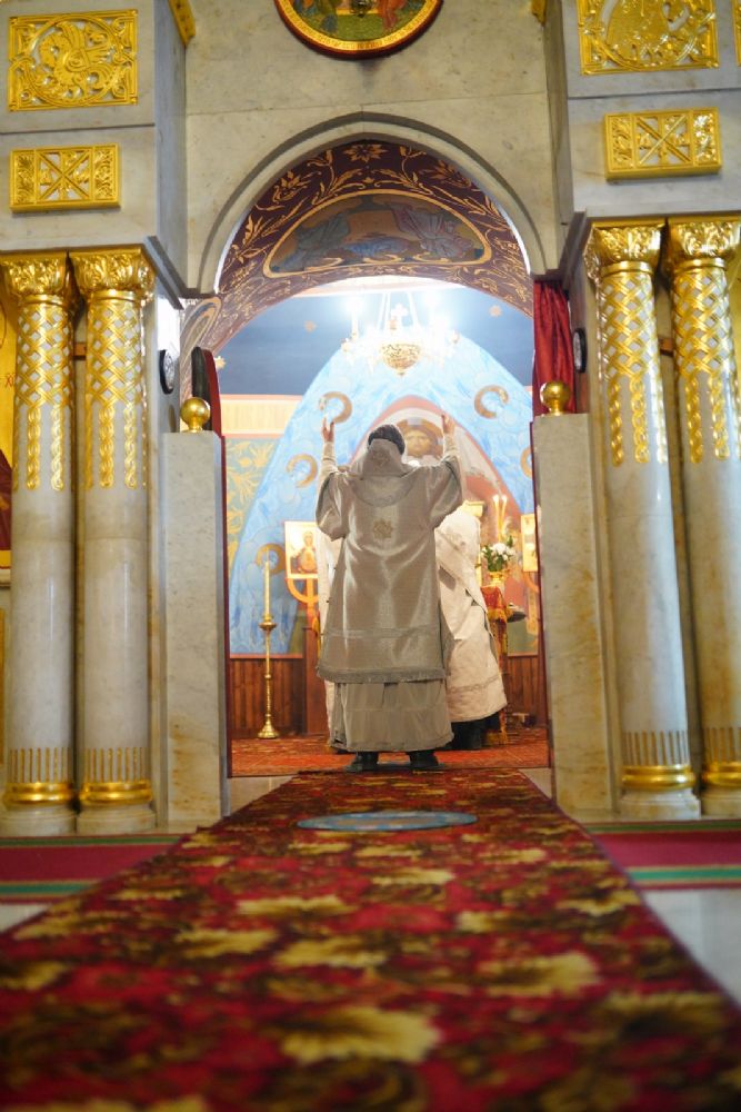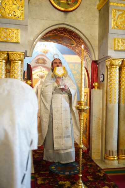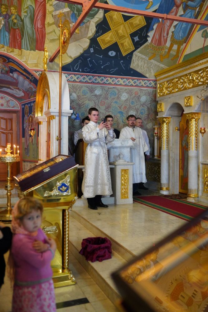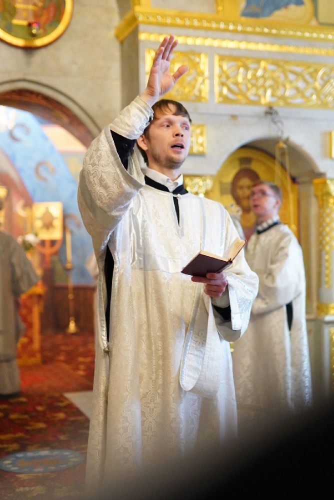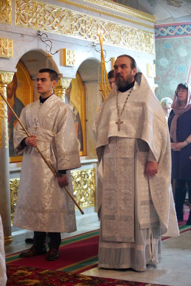 Его Высокопреосвященству сослужили секретарь Йошкар-Олинского епархиального управления иеромонах Серафим (Пасанаев), клирики Вознесенского собора г. Йошкар-Олы иерей Олег Большаков и диакон Владимир Лихачев и протодиакон Михаил Козловский. Песнопения исполнял хор Троицкого храма под руководством регента Анны Ярошевич.