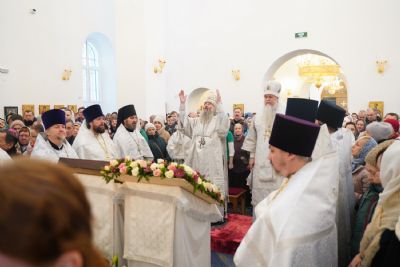 Освящение началось с торжественной встречи митрополита Иоанна, который под пение тропарей внес в храм частицы мощей святых Вифлеемских мучеников-младенцев и священномученика Владимира, митрополита Киевского, которые были вложены в престолы и в антиминсы. Было освящено сразу три престола – главный в честь иконы Божией Матери «Всех скорбящих Радость», боковой во имя блаженной Матроны Московской, а также приставной престол в честь святителя Тихона, Патриарха всея России, для Успенского храма г. Йошкар-Олы.