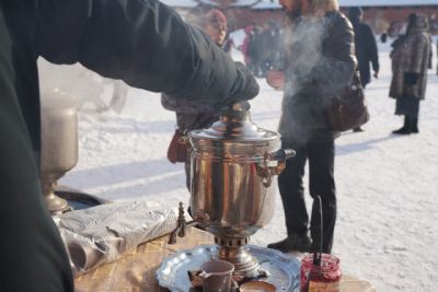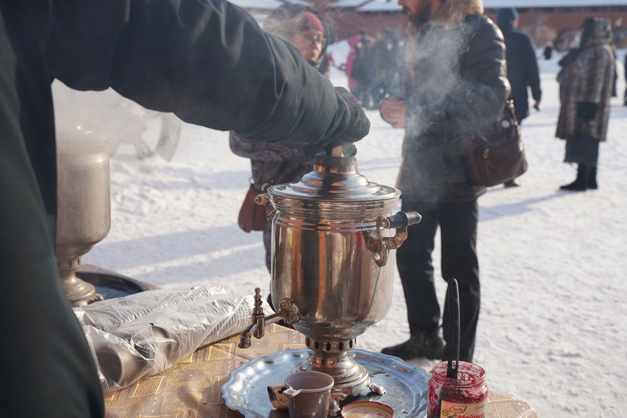 И, конечно, какой же праздник без угощения? Под открытым небом развернулись столы с традиционным самоваром и баранками, разносили угощения и коробейники в традиционных русских костюмах. Простое и вкусное угощение пришлось по вкусу всем гостям.