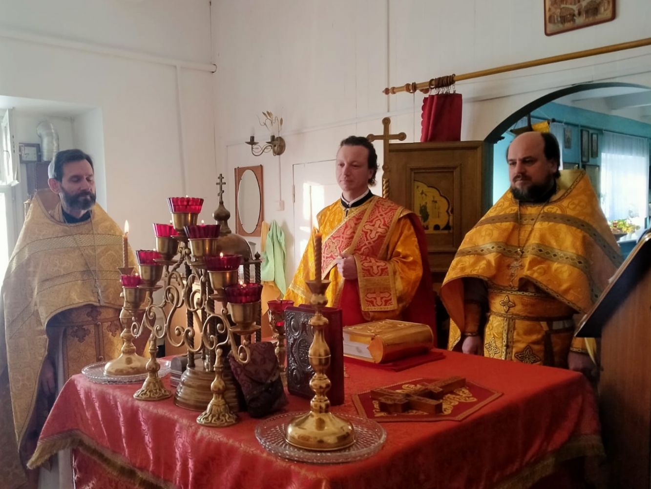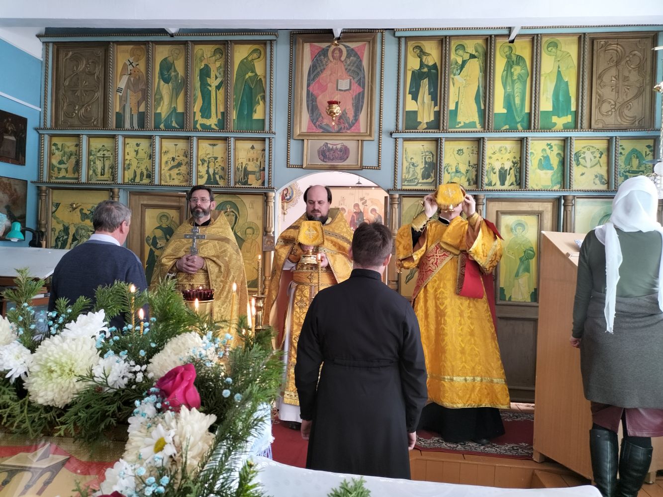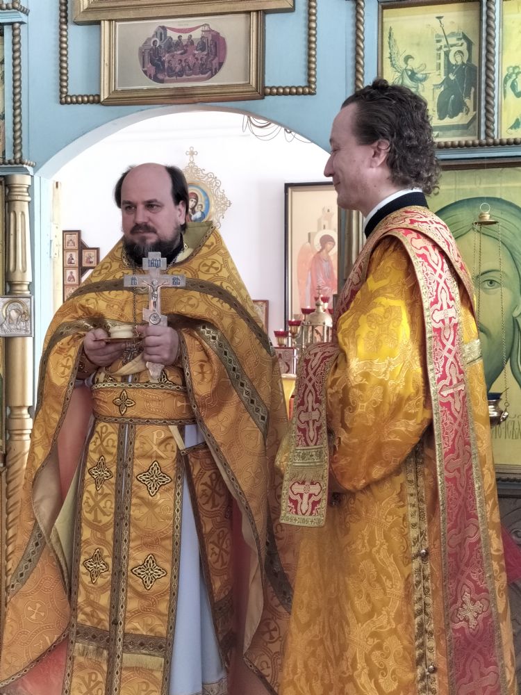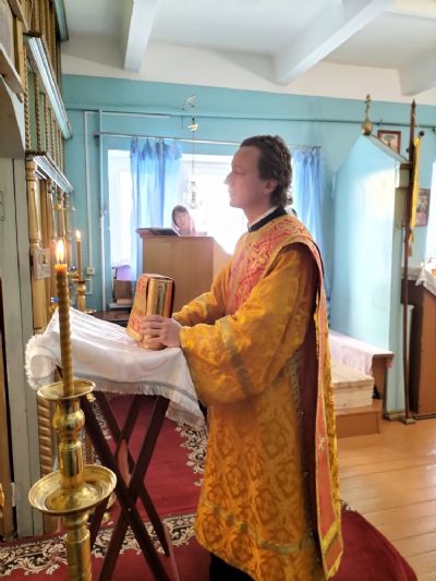 Совершать Божественную литургию вместе с отцом Николаем приехали настоятель храма Первоверховных апостолов Петра и Павла с. Верх-Ушнур иерей Алексий Тарасов и клирик Вознесенского собора г. Йошкар-Олы диакон Сергий Метелев. Песнопения исполнял хор Троицкого храма г. Йошкар-Олы под управлением Анны Ярошевич.
