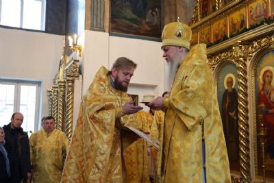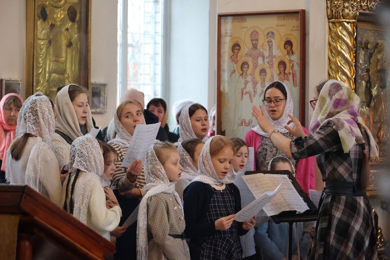 Его Преосвященству сослужили клирики собора, песнопения исполняли два хора: архиерейский (регент Любовь Михеева) и детско-юношеский хор «Славословие» (регент Мария Захарова).