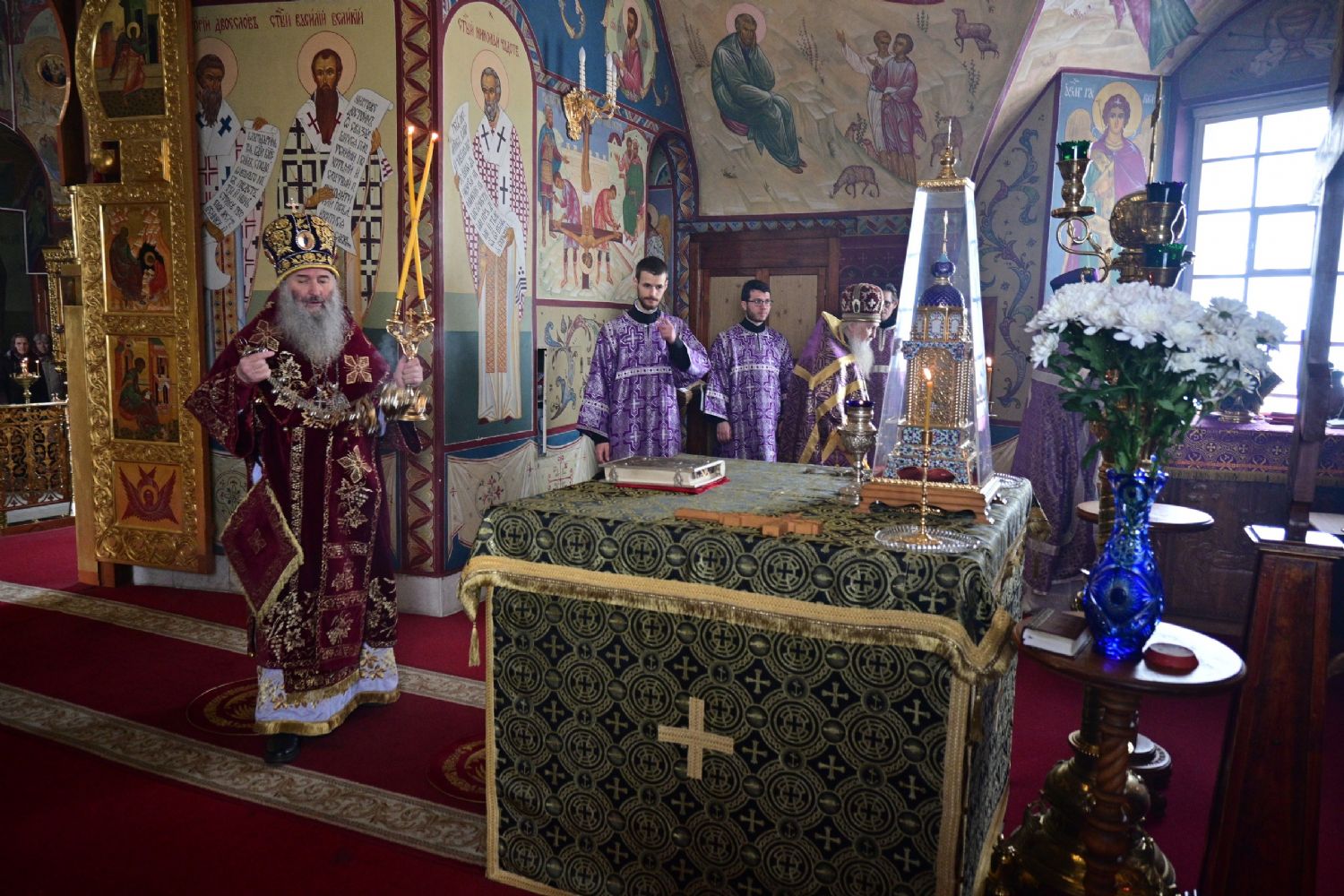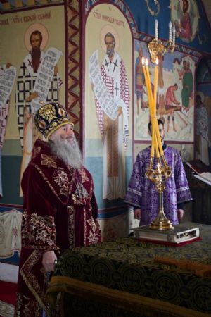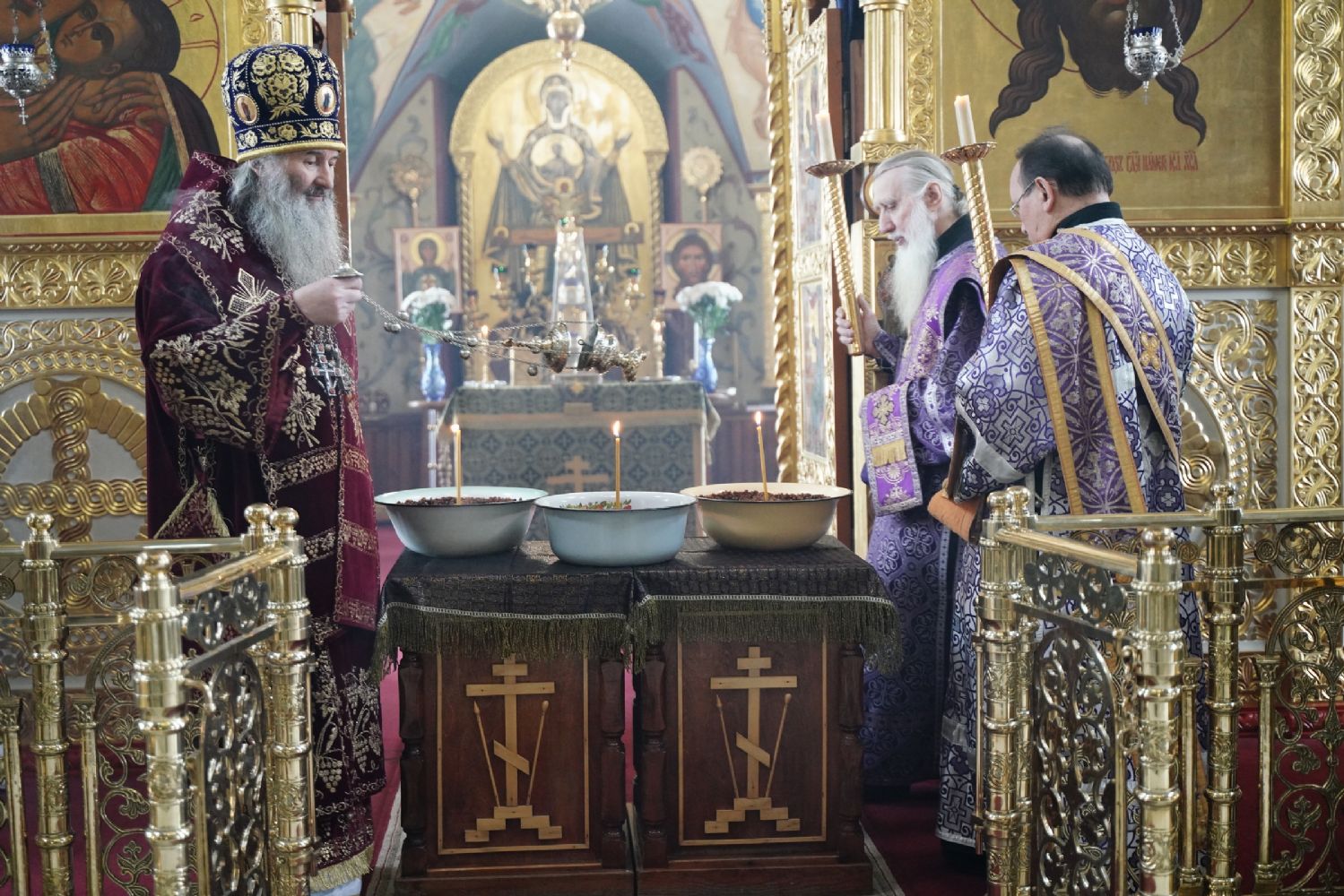 По заамвонной молитве перед Царскими вратами духовенство совершило молебный канон великомученику Феодору Тирону, и владыка освятил коливо.