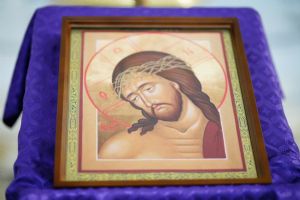 И вот сегодня в акафистном песнопении для нас открывалось, как Господь через свои страдания лечит нашу душу и наше тело, порабощенное грехами и страстями. Наше сердце окаменевшее и не способное к доброй жизни с Богом, согревает Своею любовью. Кровью Своей, струившейся из-под тернового венца, очищает главу нашу, освобождая ум от суетных и греховных помышлений. Кровь Его из ран гвоздиных на руках и ногах омывает наши безумные деяния, наши хождения по греховным путям. Каждому из нас Господь указывает истинный путь, ведущий в вечность, – это смиренное несение креста своего. Он говорит: кто за Мной последует, тот со Мной и будет во веки. И мы должны в жизни своей, следуя за Господом, творить дела любви и милосердия, уподобляясь нашему Спасителю в той любви, которую Он не словами, а жизнью Своею и страданиями нам показал.