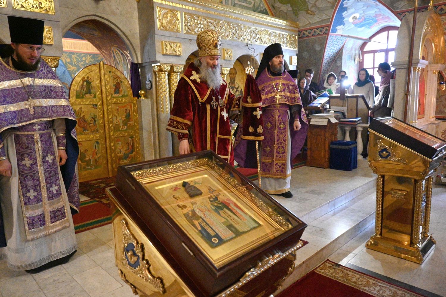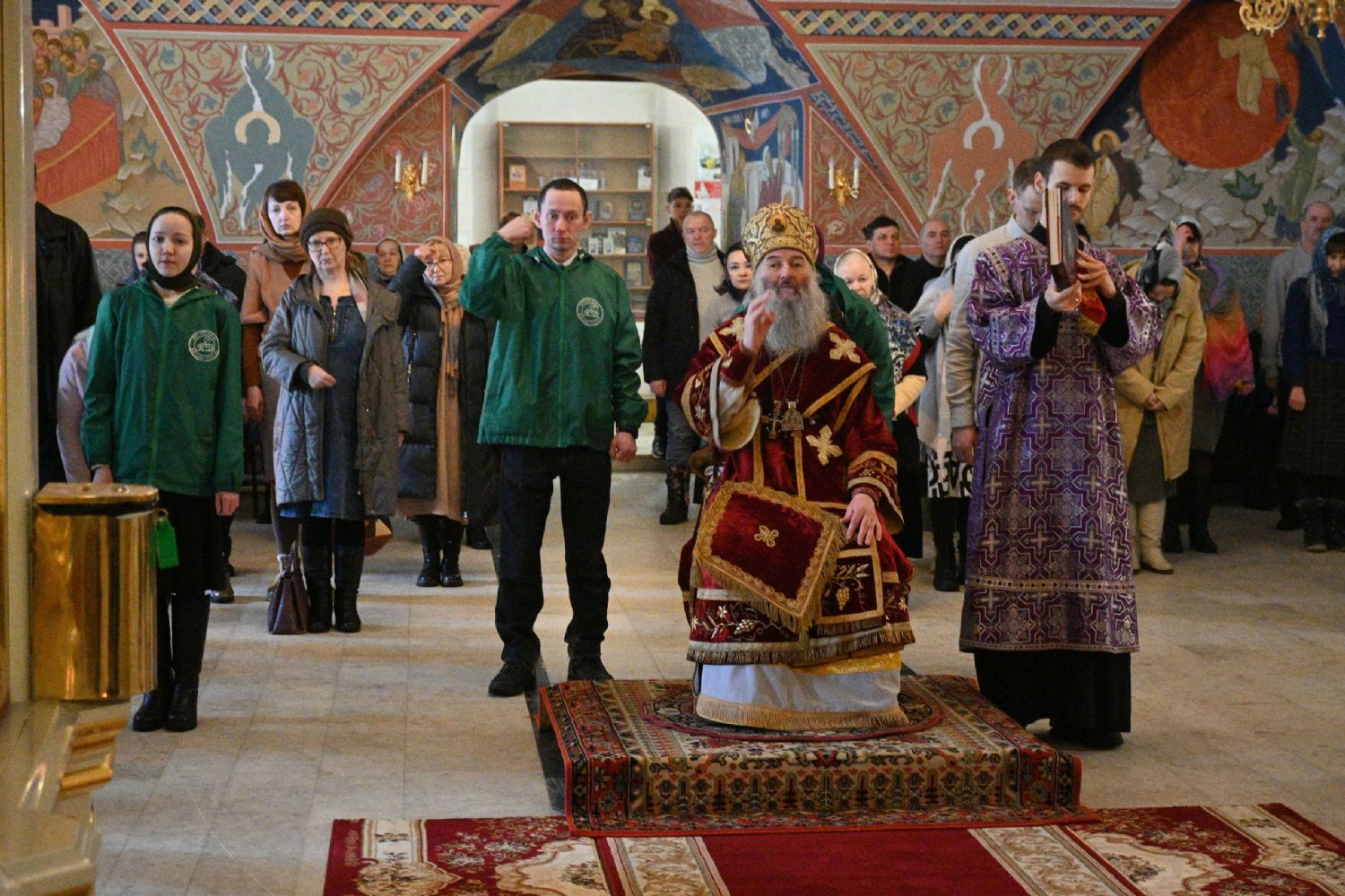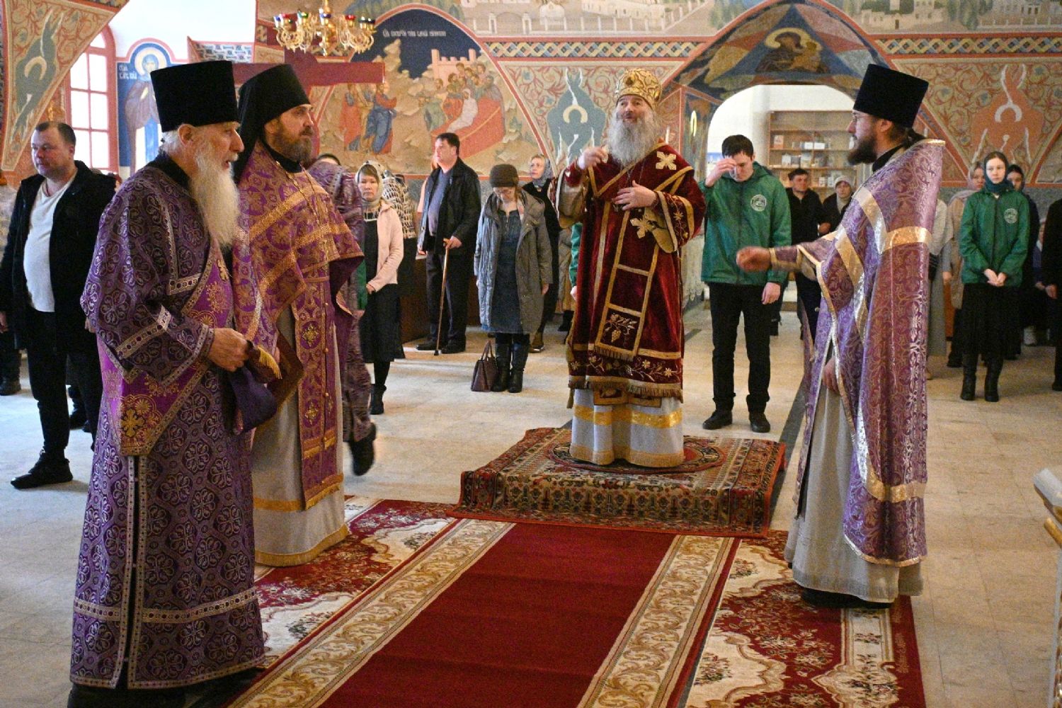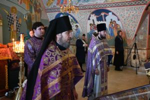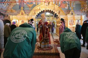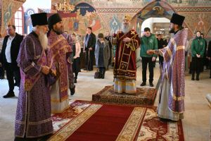 Владыке сослужили секретарь Йошкар-Олинского епархиального управления иеромонах Серафим (Пасанаев), клирик Вознесенского собора иерей Димитрий Копылов и протодиакон Михаил Козловский. Песнопения исполнял хор храма под управлением Анны Ярошевич, а также детский хор воспитанников воскресной школы храма.