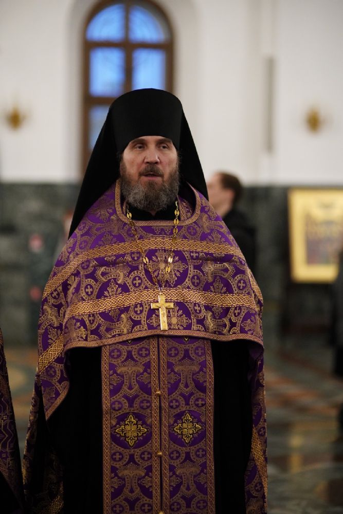 Владыке сослужили секретарь Йошкар-Олинского епархиального управления иеромонах Серафим (Пасанаев), ключарь собора протоиерей Сергий Поглазов, клирики собора иереи Никифор Захаров, Евгений Самойлов, Александр Староверов и Иоанн Милютин, диаконы Андрей Дружинин и Артемий Бобоч, а также протодиакон Михаил Козловский. Пели старший и младший составы детско-юношеского хора «Благовест» под управлением регентов Татьяны Черновой и Надежды Поздеевой. Часть песнопений в алтаре исполнял хор духовенства под руководством иерея Евгения Самойлова.