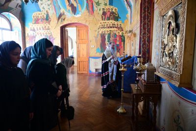 28 марта митрополит Йошкар-Олинский и Марийский Иоанн возглавил вечернее богослужение в домовом храме Йошкар-Олинского епархиального управления в честь иконы Божией Матери «Троеручица».