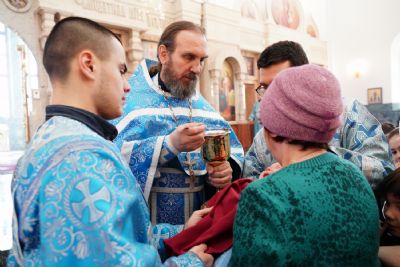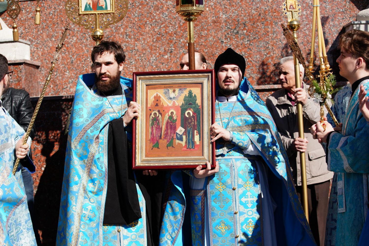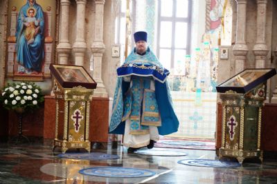 После Литургии в ознаменование престольного праздника состоялся крестный ход вокруг храма с чтением Евангелия и кроплением святой водой. По традиции, сложившейся за последние годы, священство и миряне подошли к скульптурной композиции «Пресвятая Богородица с Младенцем Христом». Здесь верующие вознесли соборную молитву Покровительнице нашего края.