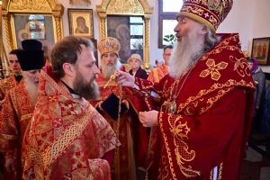 На входе с Евангелием митрополит Иоанн вручил богослужебно-иерархическую награду иерею Алексию Добикову - он удостоен права ношения наперсного креста золотого цвета.