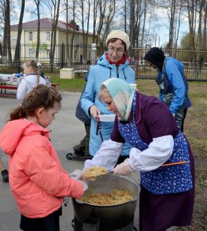 После концертной части, по доброй традиции, на территории Предтеченского храма всех ждала общая трапеза. В меню – каша, сваренная на костре, чай со сладостями. Желающие смогли поучаствовать в играх и конкурсах, организованных работниками клубной системы района.