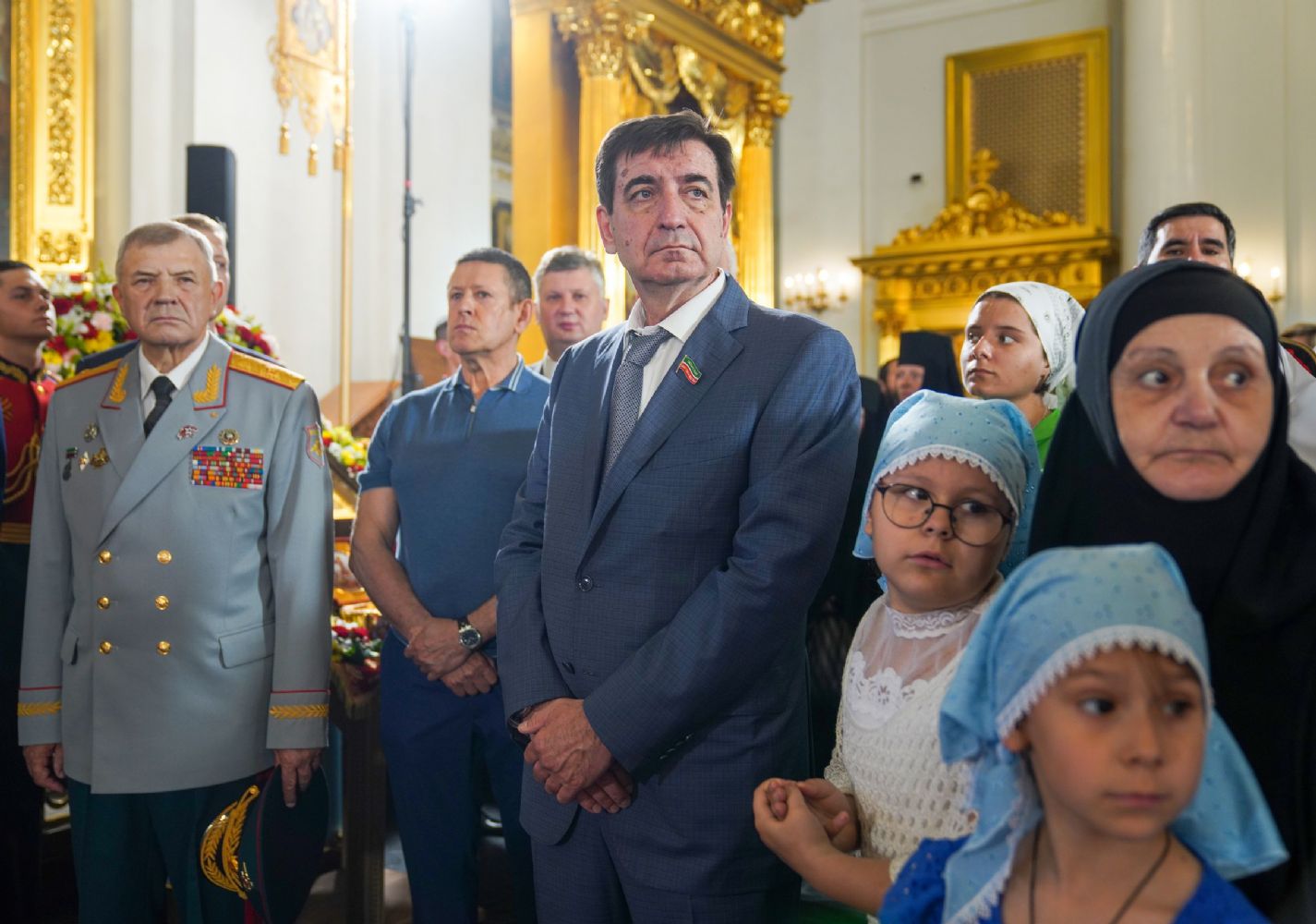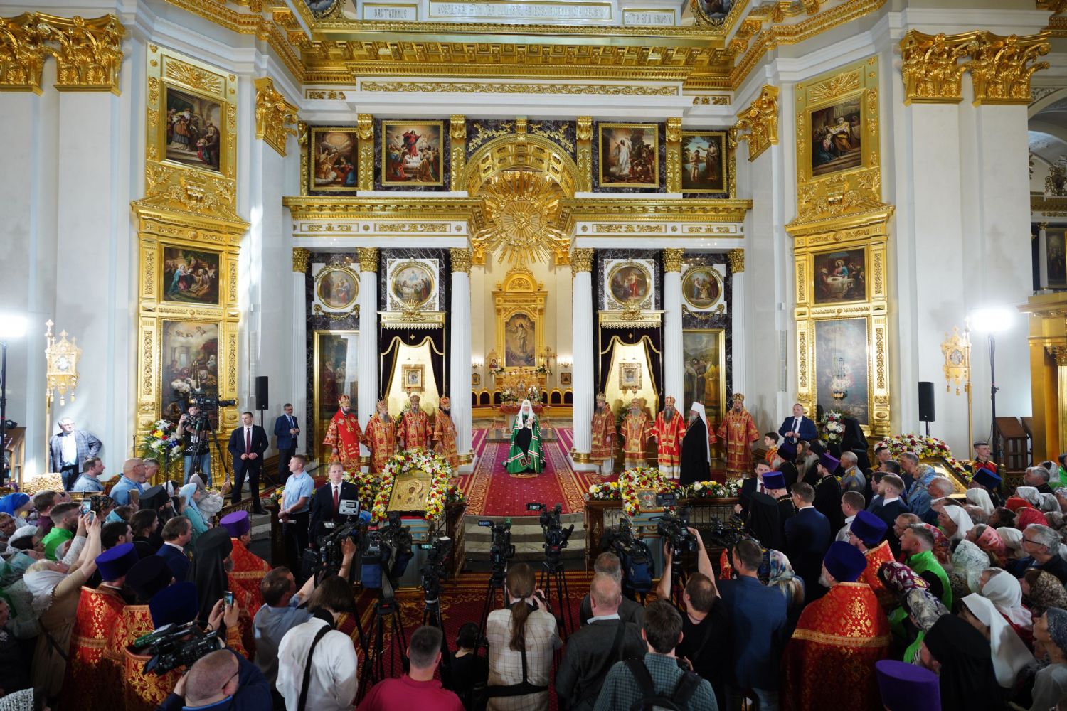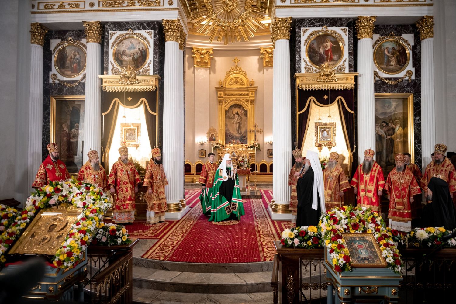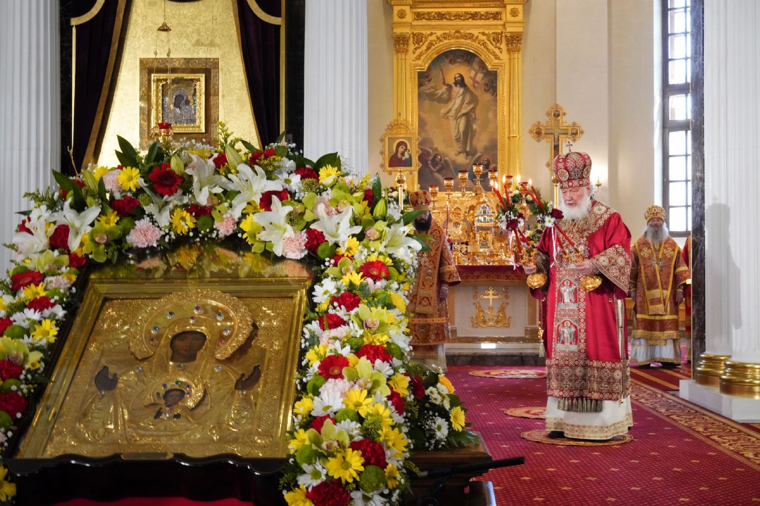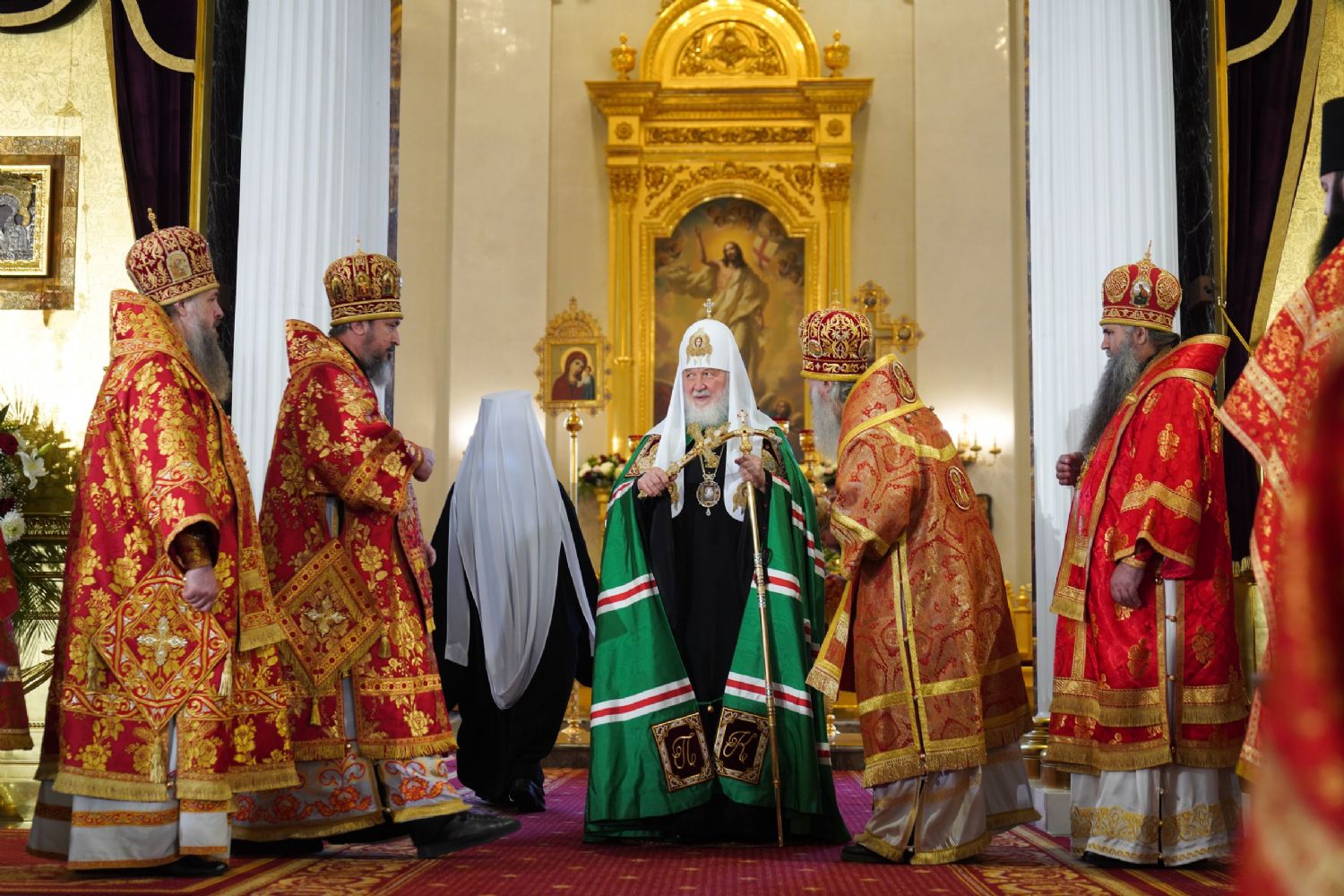 Его Святейшеству сослужили: митрополит Воскресенский Дионисий, управляющий делами Московской Патриархии; митрополит Волоколамский Антоний, председатель Отдела внешних церковных связей; митрополит Йошкар-Олинский и Марийский Иоанн; митрополит Казанский и Татарстанский Кирилл; митрополит Нижегородский и Арзамасский Георгий; митрополит Чебоксарский Чувашский Савватий; митрополит Саранский и Мордовский Зиновий; митрополит Пензенский и Нижнеломовский Серафим; епископ Чистопольский и Нижнекамский Пахомий; епископ Альметьевский и Бугульминский Мефодий; архимандрит Филарет (Булеков), заместитель председателя ОВЦС МП; архимандрит Алексий (Туриков), личный секретарь Святейшего Патриарха Кирилла; иеромонах Кирилл (Корытко), секретарь Татарстанской митрополии; игумен Марк (Виленский), наместник Казанского Богородицкого мужского монастыря; протоиерей Леонид Калинин, председатель Экспертного совета по церковному искусству, архитектуре и реставрации; духовенство Казанской епархии и города Москвы.