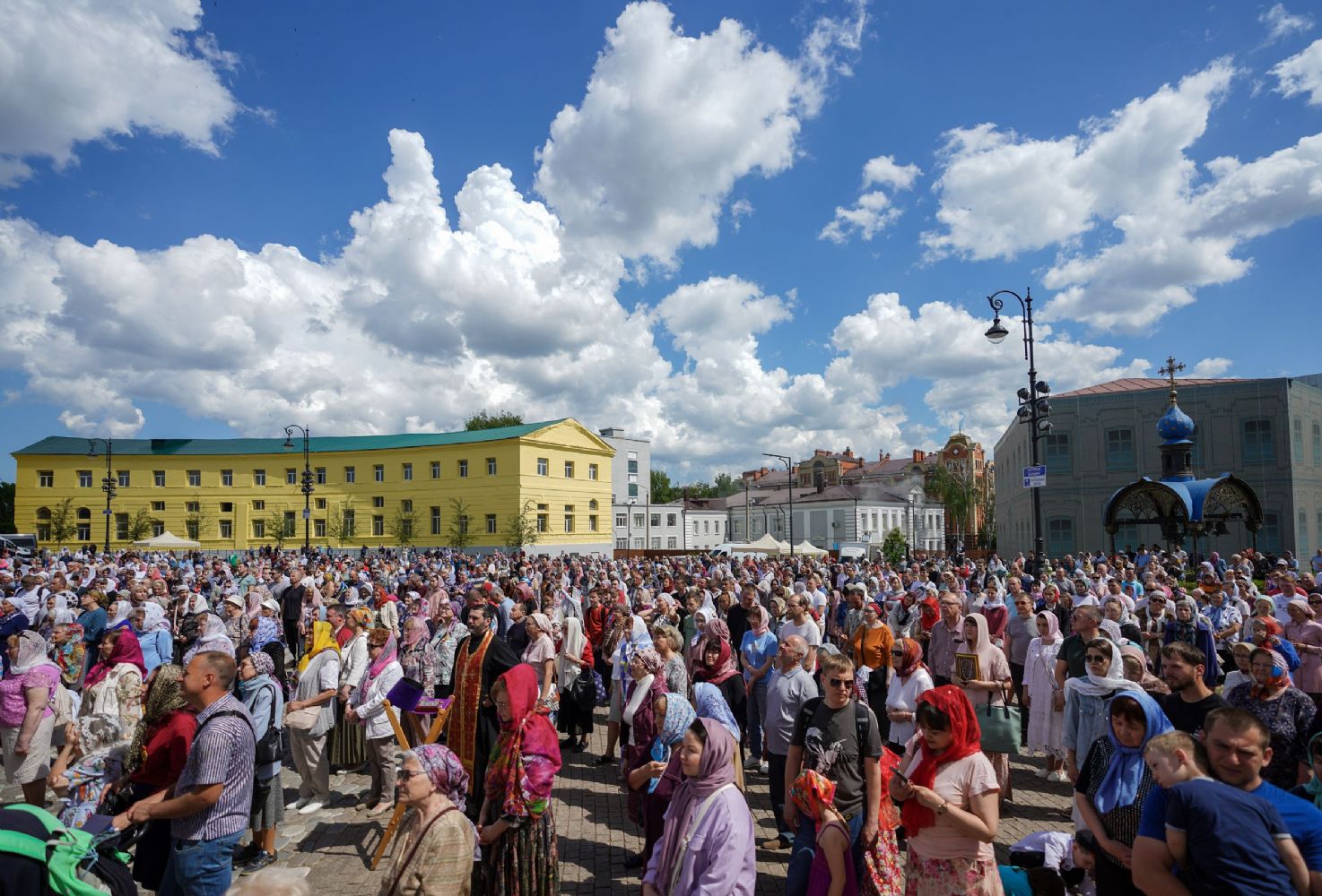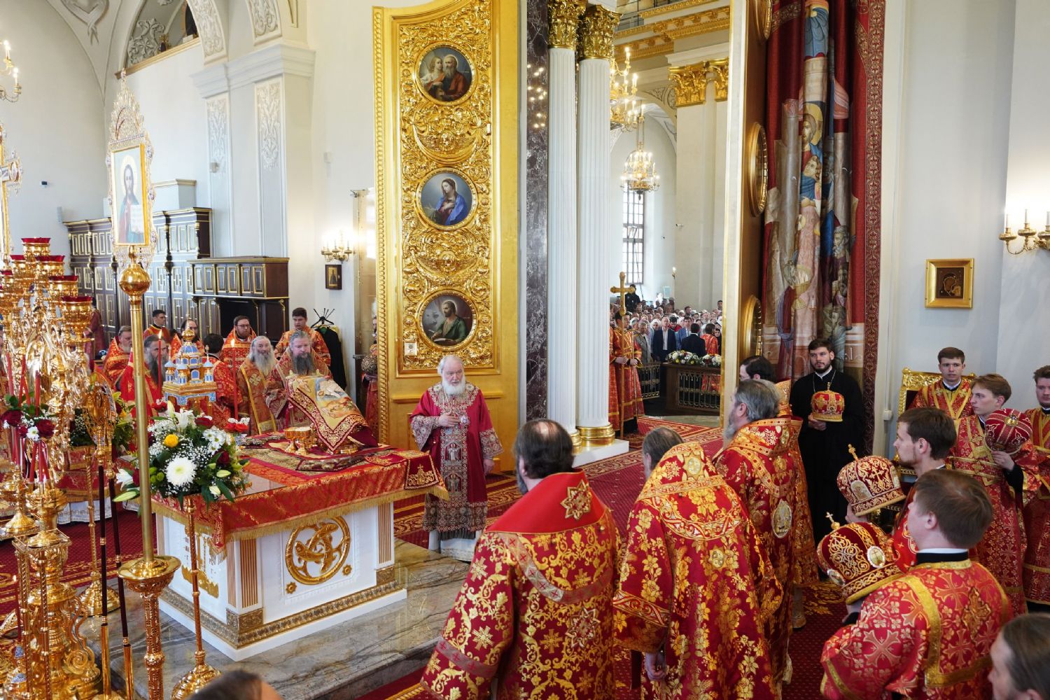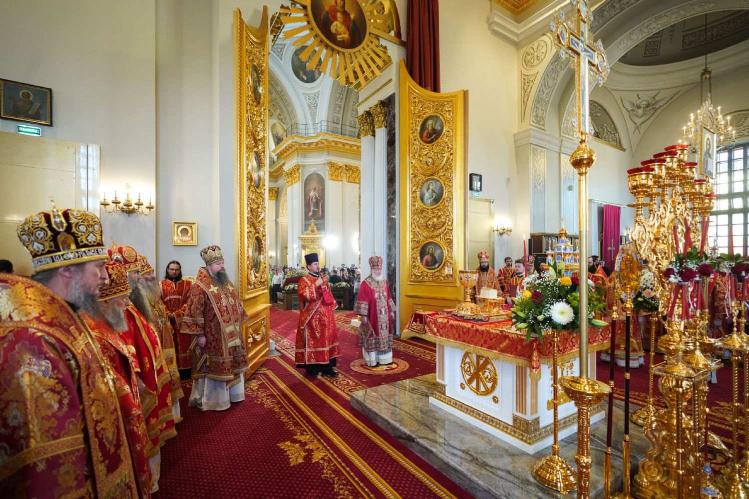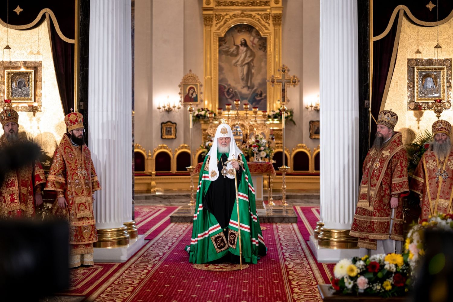 Его Святейшеству сослужили: митрополит Воскресенский Дионисий, управляющий делами Московской Патриархии; митрополит Волоколамский Антоний, председатель Отдела внешних церковных связей; митрополит Йошкар-Олинский и Марийский Иоанн; митрополит Казанский и Татарстанский Кирилл; митрополит Нижегородский и Арзамасский Георгий; митрополит Чебоксарский Чувашский Савватий; митрополит Саранский и Мордовский Зиновий; митрополит Пензенский и Нижнеломовский Серафим; епископ Чистопольский и Нижнекамский Пахомий; епископ Альметьевский и Бугульминский Мефодий; архимандрит Филарет (Булеков), заместитель председателя ОВЦС МП; архимандрит Алексий (Туриков), личный секретарь Святейшего Патриарха Кирилла; иеромонах Кирилл (Корытко), секретарь Татарстанской митрополии; игумен Марк (Виленский), наместник Казанского Богородицкого мужского монастыря; протоиерей Леонид Калинин, председатель Экспертного совета по церковному искусству, архитектуре и реставрации; духовенство Казанской епархии и города Москвы.