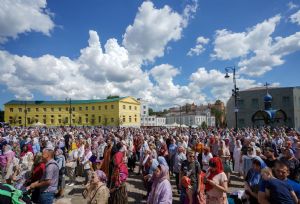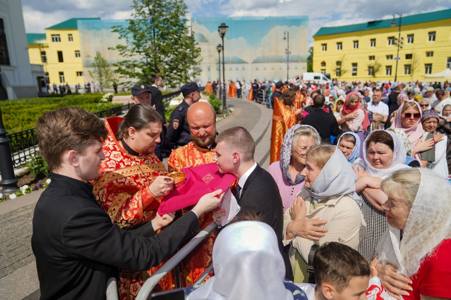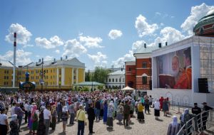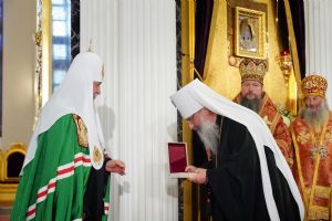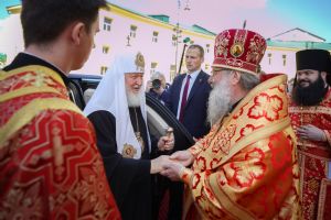 В дар Казанскому собору Предстоятель передал напрестольное Евангелие, митрополиту Казанскому Кириллу — наперсный крест. Верующим Святейший Владыка благословил раздать иконки святителя Ермогена с Патриаршим благословением.