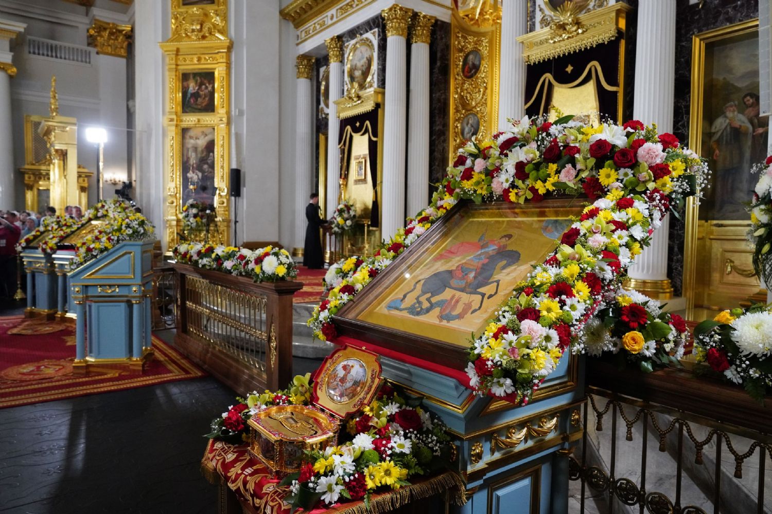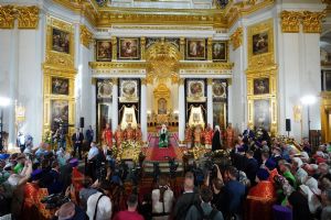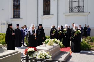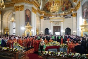 Далее Святейший Патриарх Московский и всея Руси Кирилл и архиереи, участвовавшие в богослужении, возложили цветы на могилу митрополита Феофана (Ашуркова), находящуюся за алтарем Казанского собора. Была совершена заупокойная лития, возглашена «Вечная память», а в завершение был пропет тропарь Пасхи «Христос Воскресе».