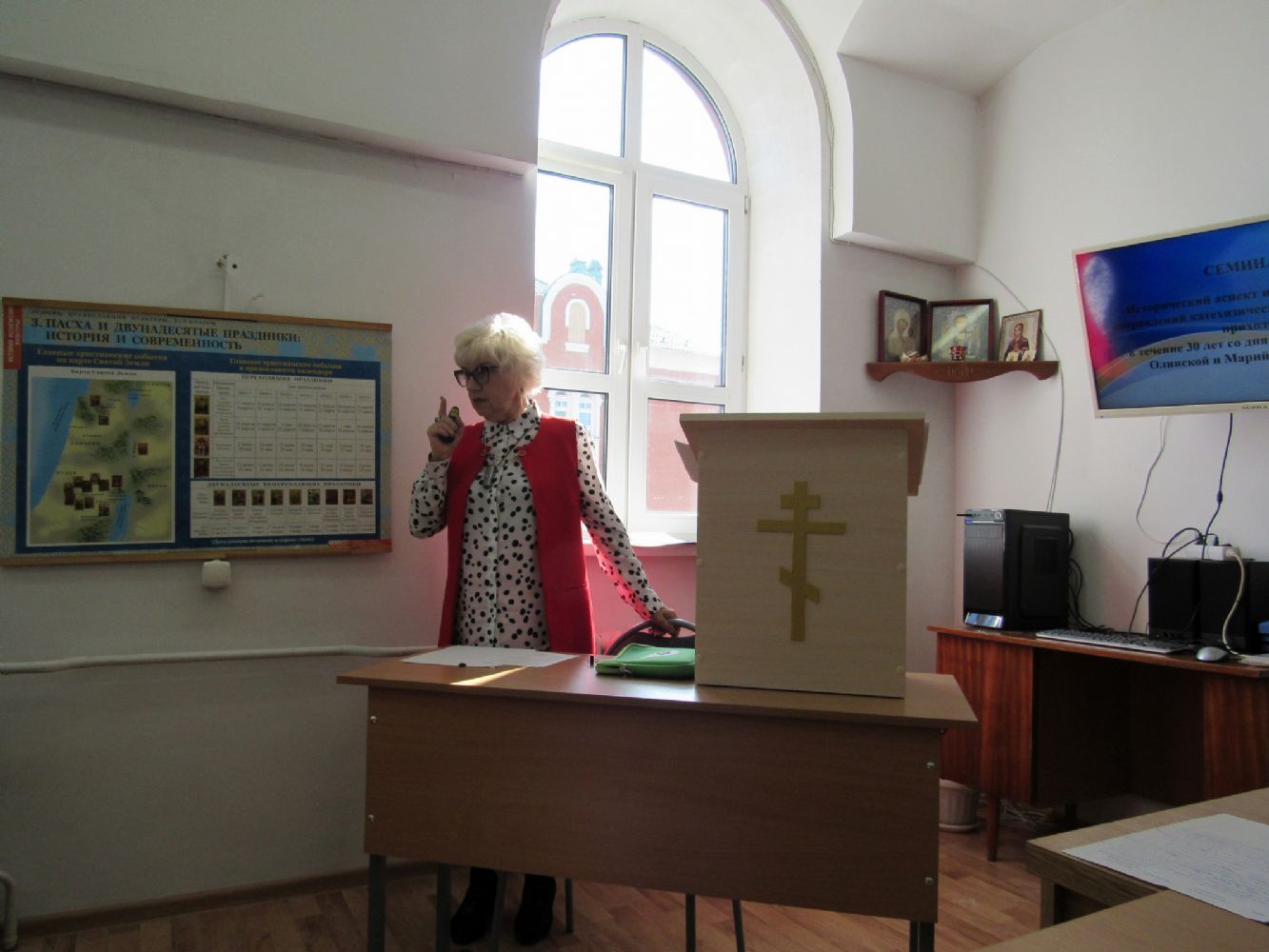 На семинаре присутствовала гость Мокрушина Алеонора Александровна, руководитель Центра духовно-нравственного воспитания «Светоч» при ДТДиМ, которая в рамках обсуждения вопроса организации летнего отдыха детей сообщила о проведении в июле профильной православной смены «Возрождение» для воспитанников воскресных школ Марийской митрополии на базе загородного детского образовательного центра «Радужный» «Дворца творчества детей и молодежи» (д. Сенькино).
