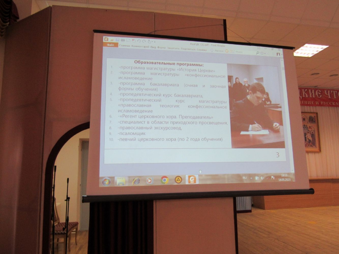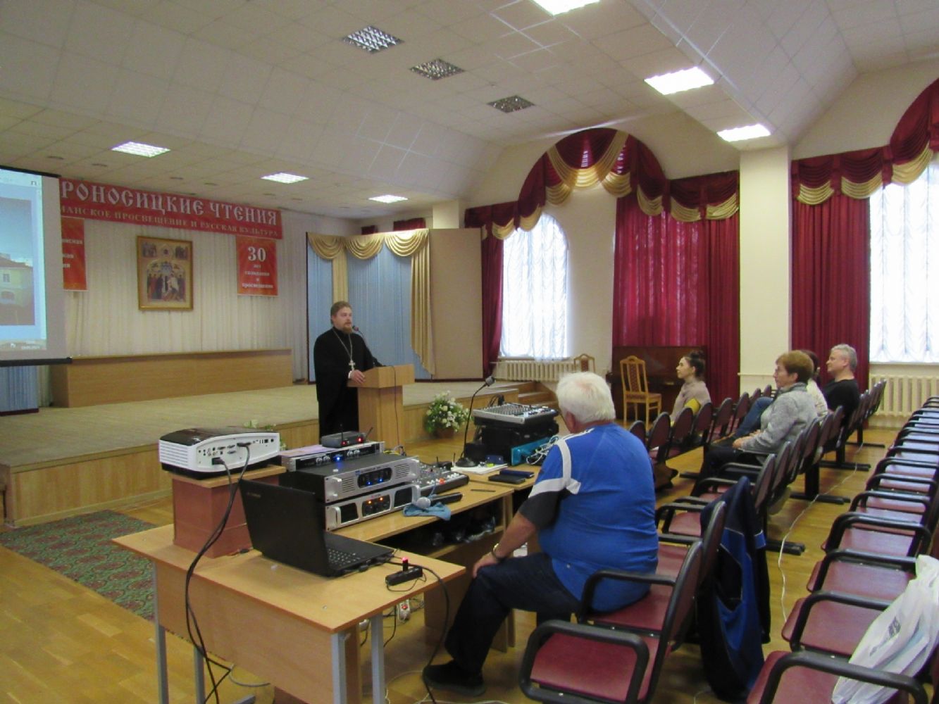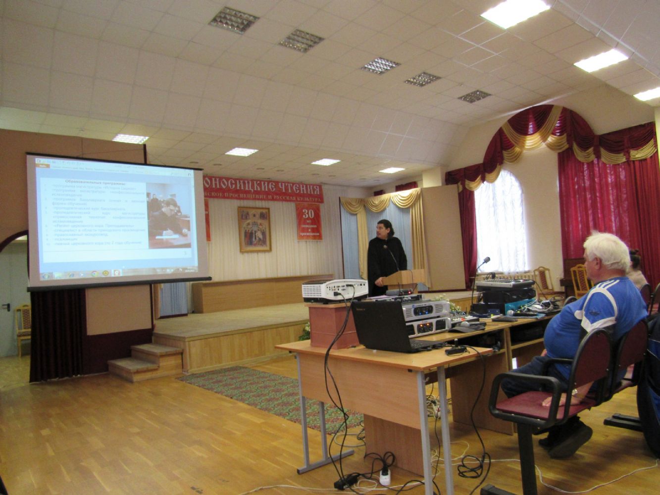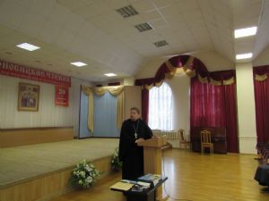 Перед аудиторией выступили иерей Димитрий Ларионов, секретарь Ученого Совета и диакон Андрей Зотин, проректор по учебной работе. Они подробно рассказали о жизни семинарии, о ее истории, богослужебной жизни, условиях поступления, учебном и воспитательном процессах, материально-технической базе; показали презентацию, посвященную семинарии.