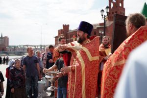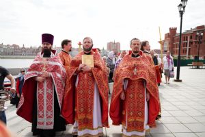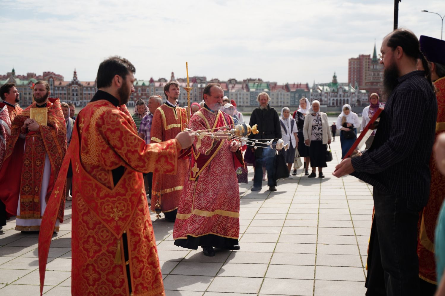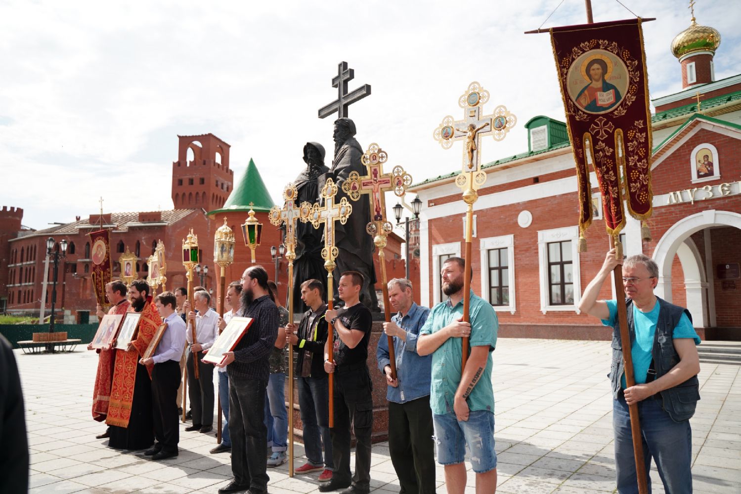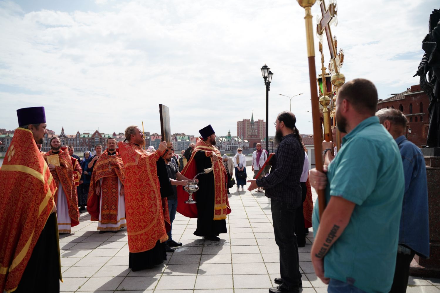 После Литургии священство и прихожане из четырех городских храмов – Благовещенского кафедрального собора, Вознесенского собора, Воскресенского собора и Троицкого храма – с иконами и хоругвями направились по набережной Кокшаги к памятнику святым Кириллу и Мефодию около Музея истории Православия.