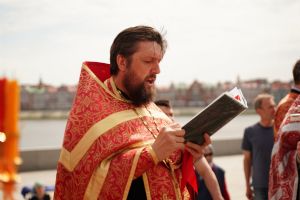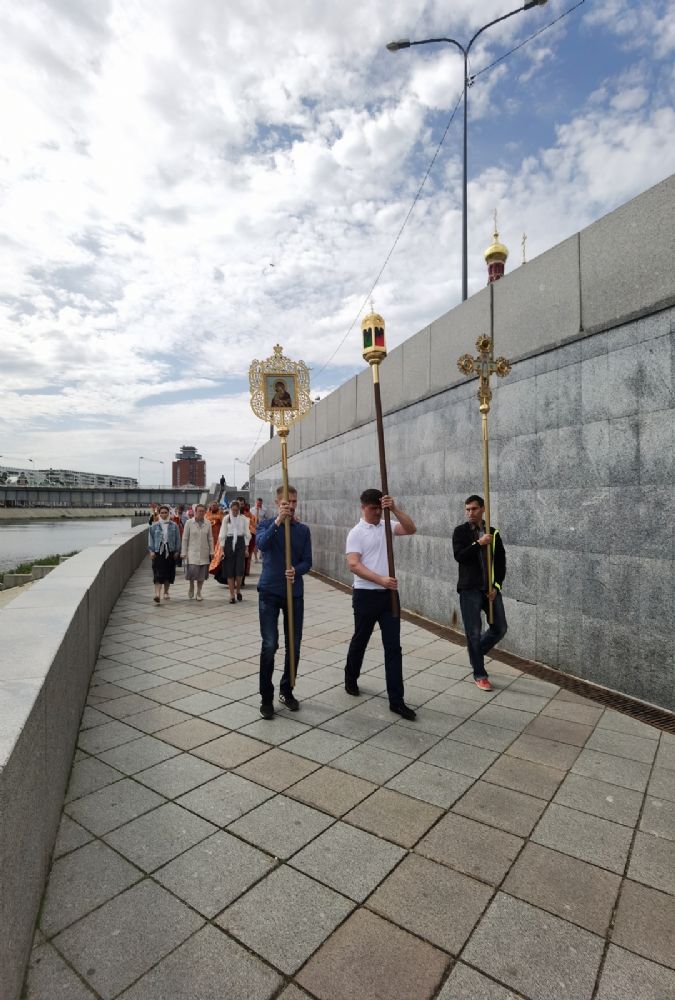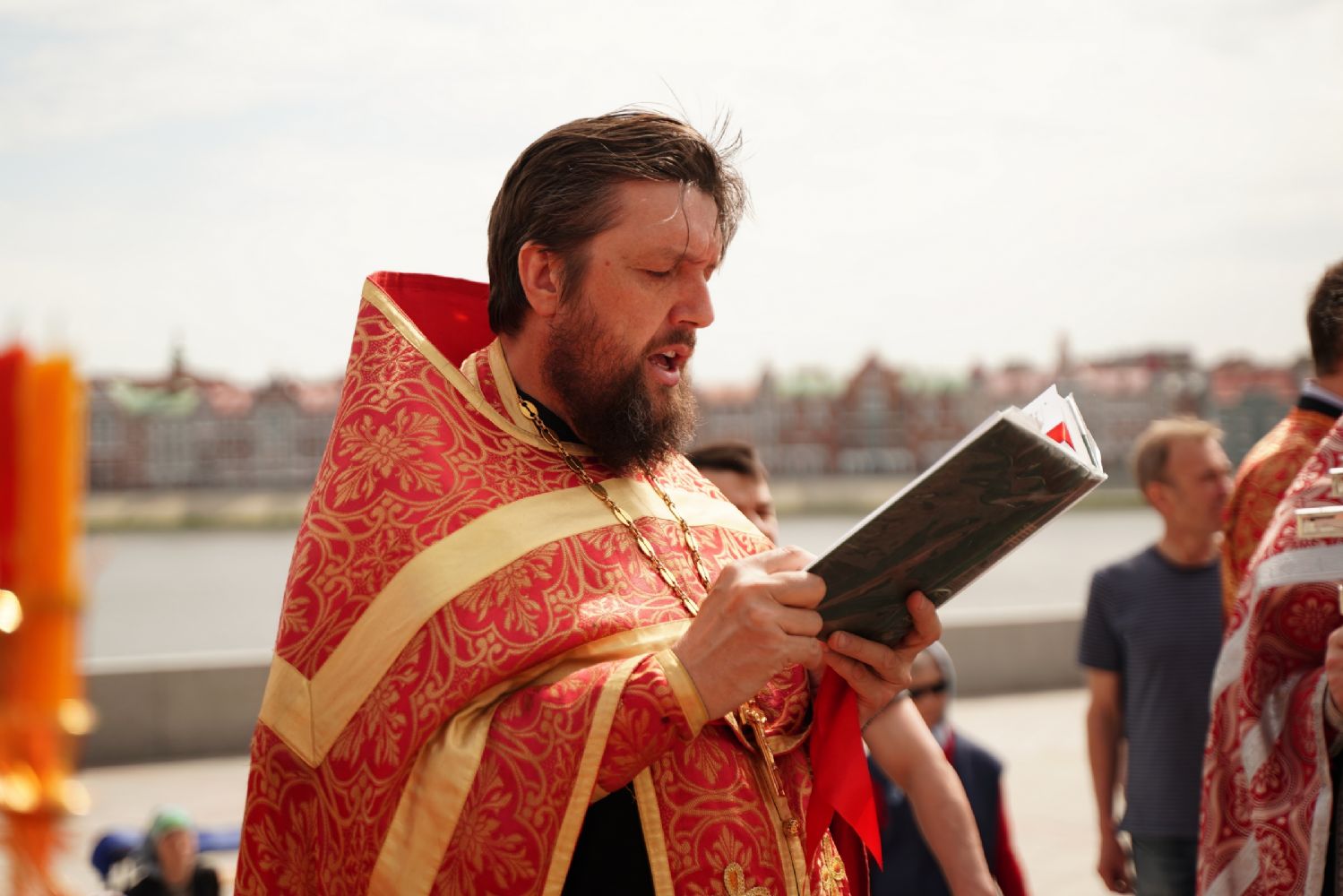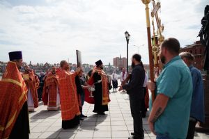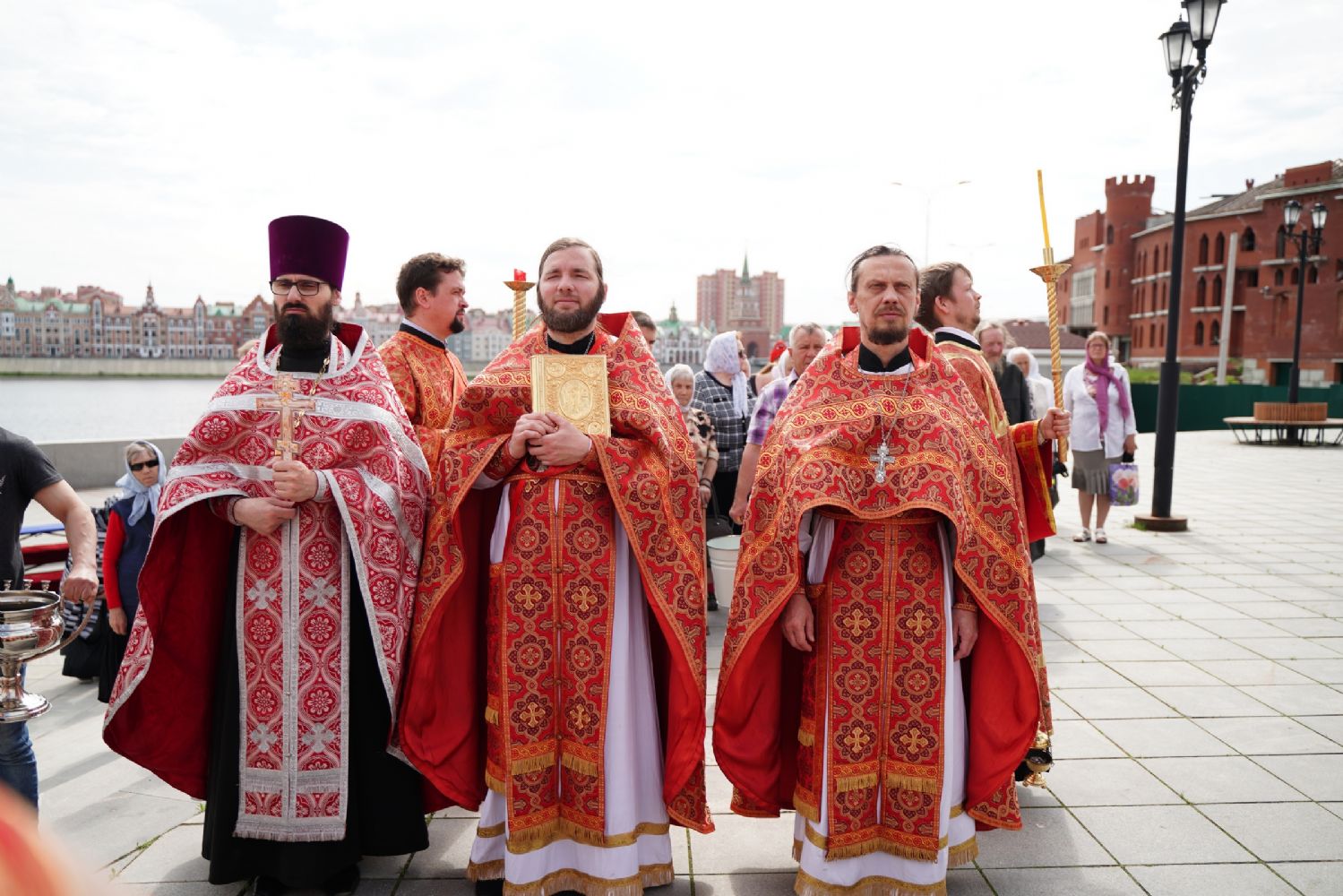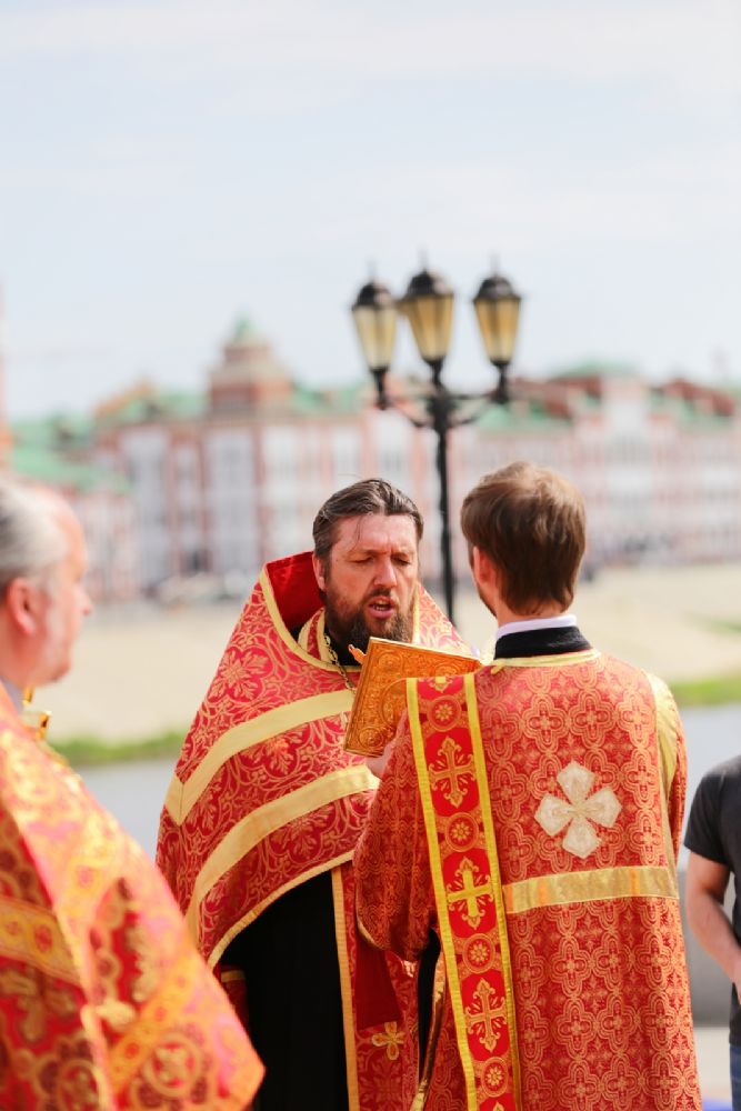После Литургии священство и прихожане из четырех городских храмов – Благовещенского кафедрального собора, Вознесенского собора, Воскресенского собора и Троицкого храма – с иконами и хоругвями направились по набережной Кокшаги к памятнику святым Кириллу и Мефодию около Музея истории Православия.