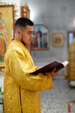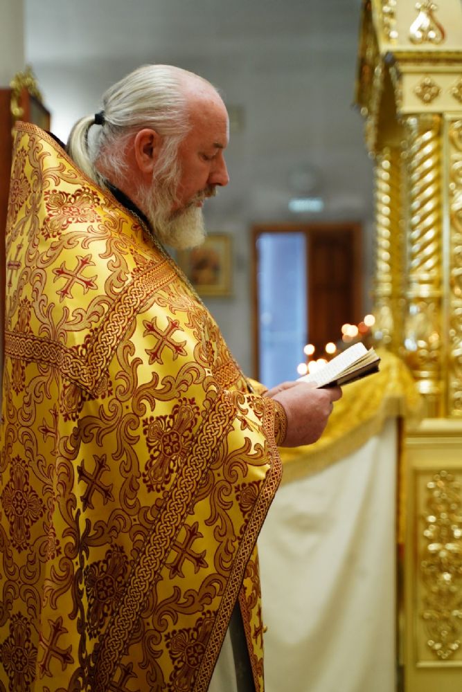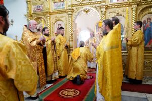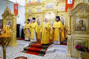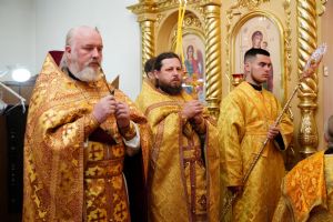 Владыке сослужили секретарь Йошкар-Олинского епархиального управления иеромонах Серафим (Пасанаев), благочинный Лугово-Марийского церковного округа, настоятель Никольского храма с. Кожла-Сола протоиерей Алексий Никитин, настоятель храма Рождества Иоанна Предтечи п. Шелангер иерей Михаил Петунин, клирик Никольского храма г. Звенигово иерей Александр Сергунин и протодиакон Михаил Козловский. Песнопения исполнял хор храма.