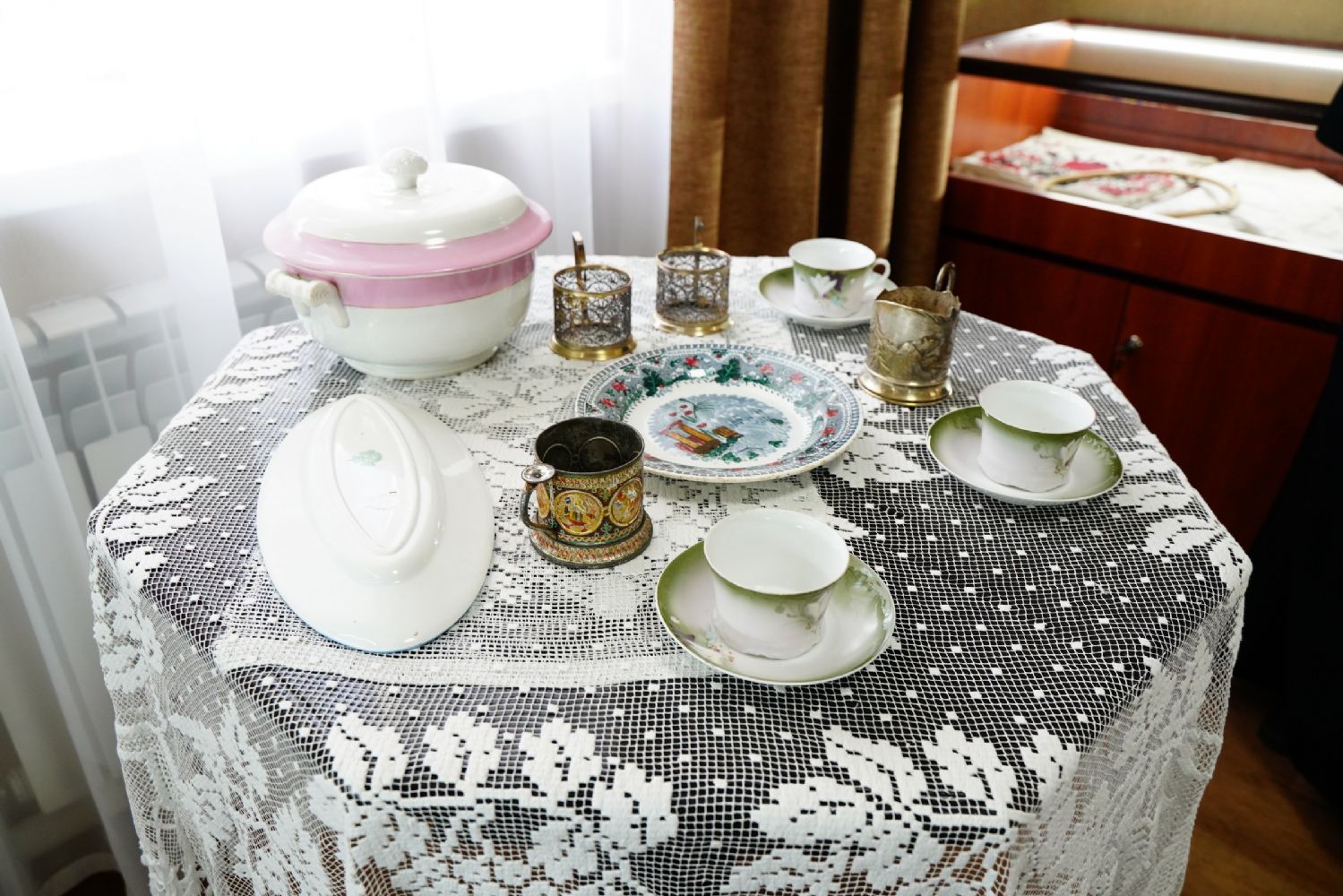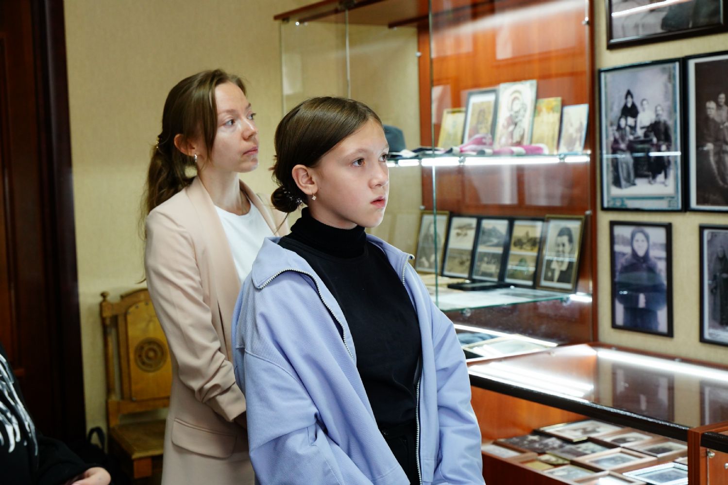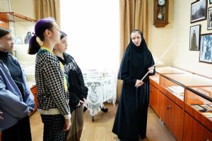 Вначале ребята посетили комнату-музей истории обители (ул. Вознесенская, д. 84-а), где насельница монастыря матушка Рафаила провела для них краткую экскурсию. Дети узнали, что царевококшайский женский монастырь был единственным в России, названным в честь явления Божией Матери преподобному Сергию Радонежскому. Год открытия монастыря – 1888. При нем действовали церковно-приходская школа, приют для сирот, странноприимный дом, больница для насельниц. В музейной комнате трудами матушки Рафаилы собраны фотографии, документы, личные вещи сестер обители, их рукоделие, иконы и книги.