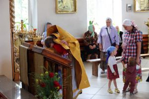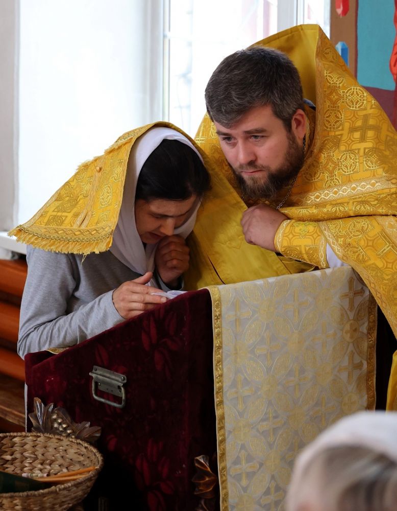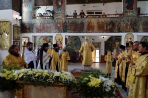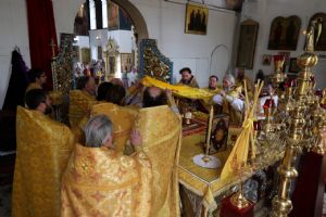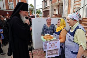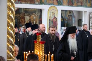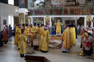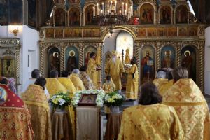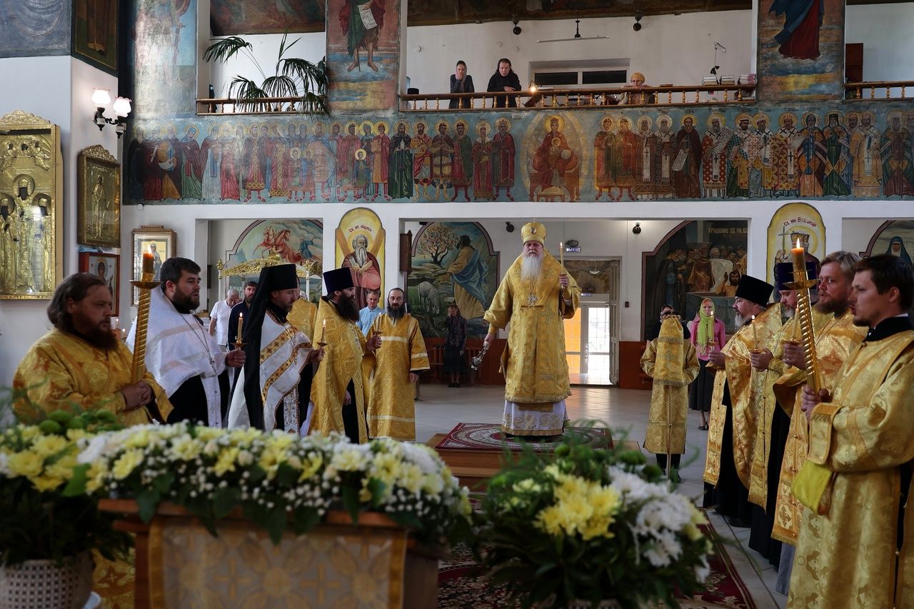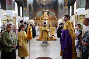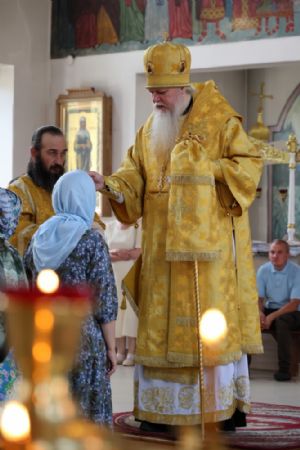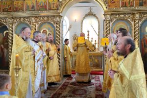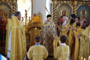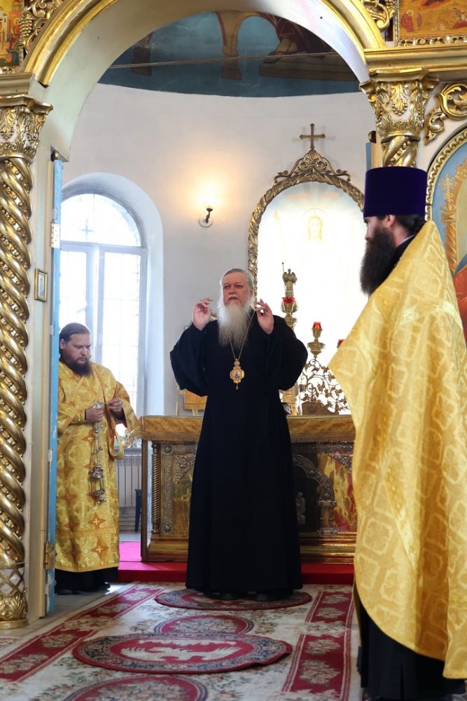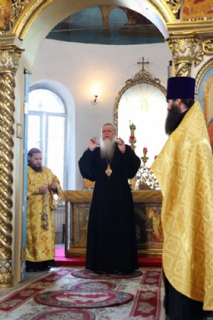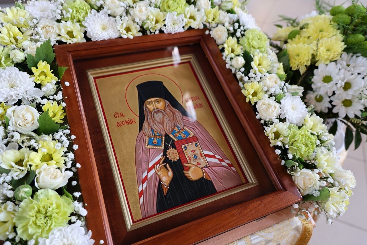 По заамвонной молитве было совершено славословие святителю Феофану. По окончании Литургии глава епархии обратился к собравшимся с архипастырским словом, напомнив празднуемое в этот день событие – перенесение в 2002 году мощей святителя Феофана Затворника Вышенского из приходского храма преподобного Сергия Радонежского с. Эммануиловка Рязанской области в Вышенский Успенский монастырь, где святитель нес подвиг затвора и молитвы за весь мир и написал множество духовных трудов.