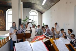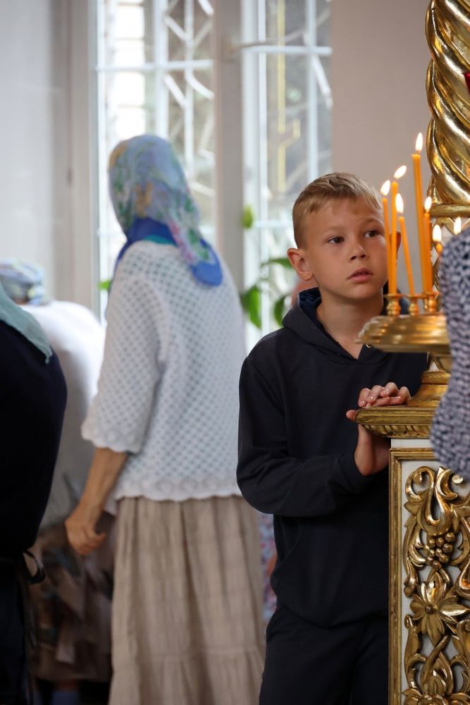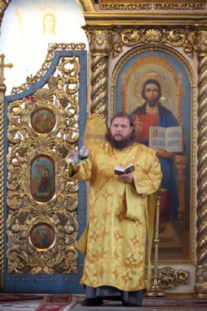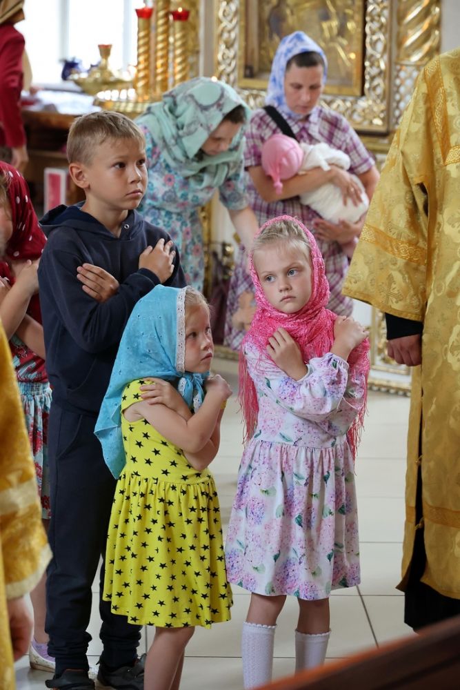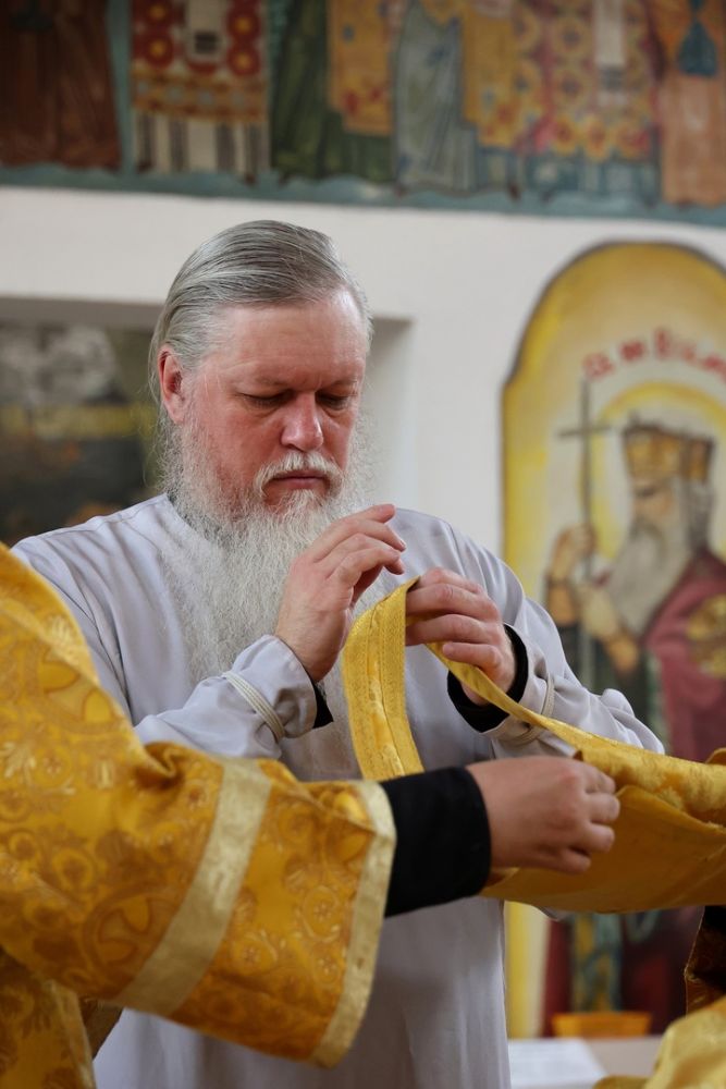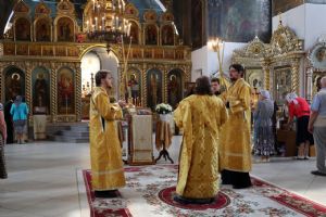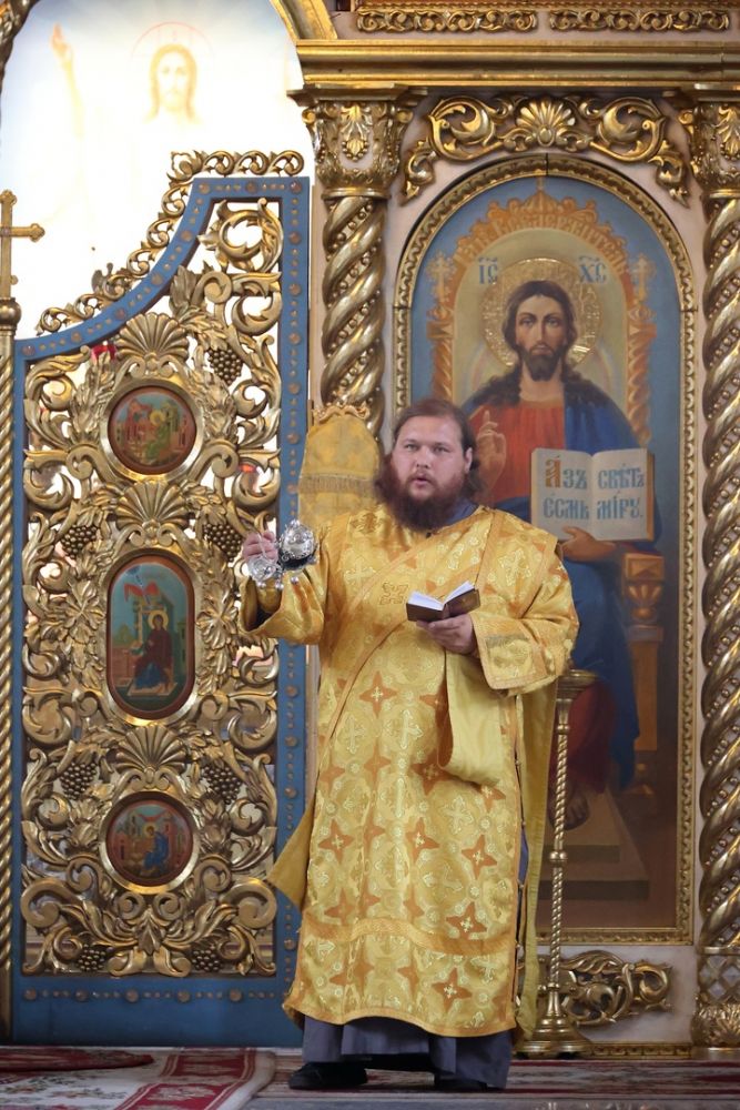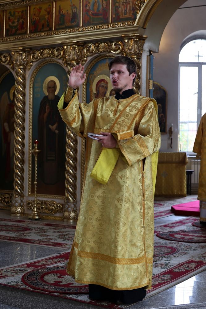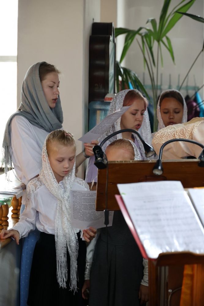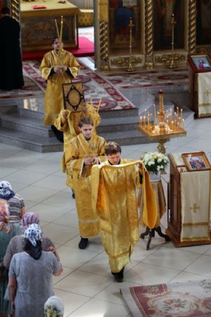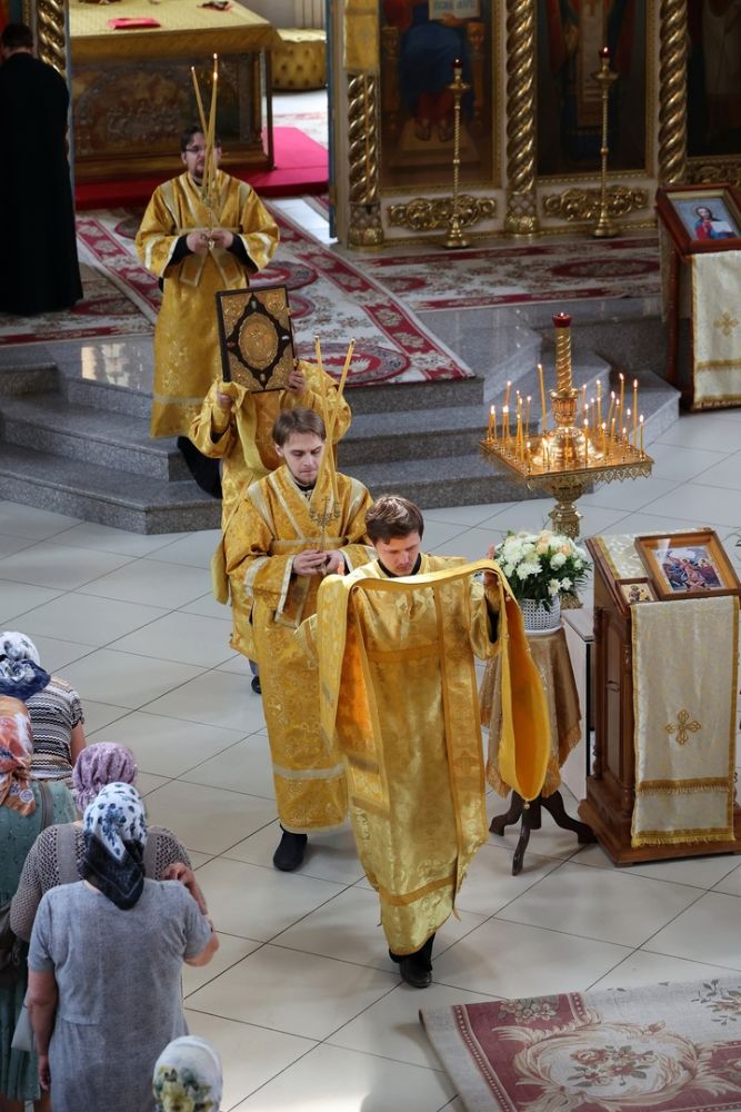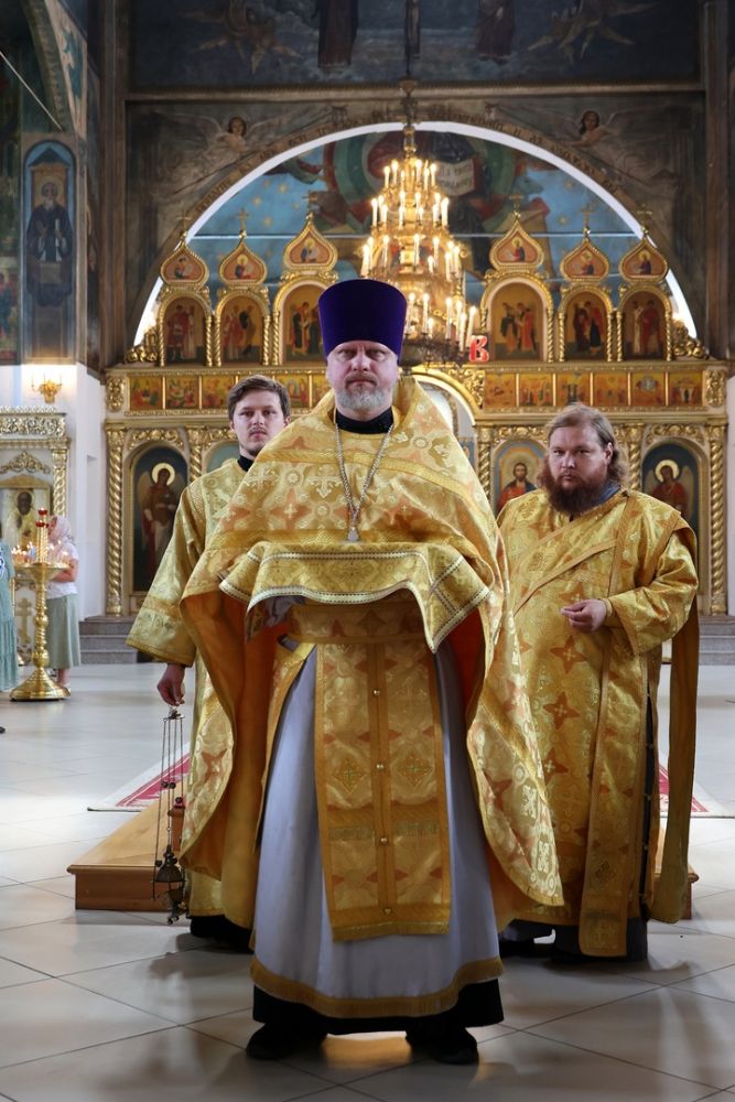 Его Преосвященству сослужили клирики собора иерей Сергий Першаков, диакон Иоанн Захаров, диакон Герман Михайлов. Песнопения исполняли детско-юношеский хор «Славословие» под управлением Марии Захаровой и архиерейский хор.