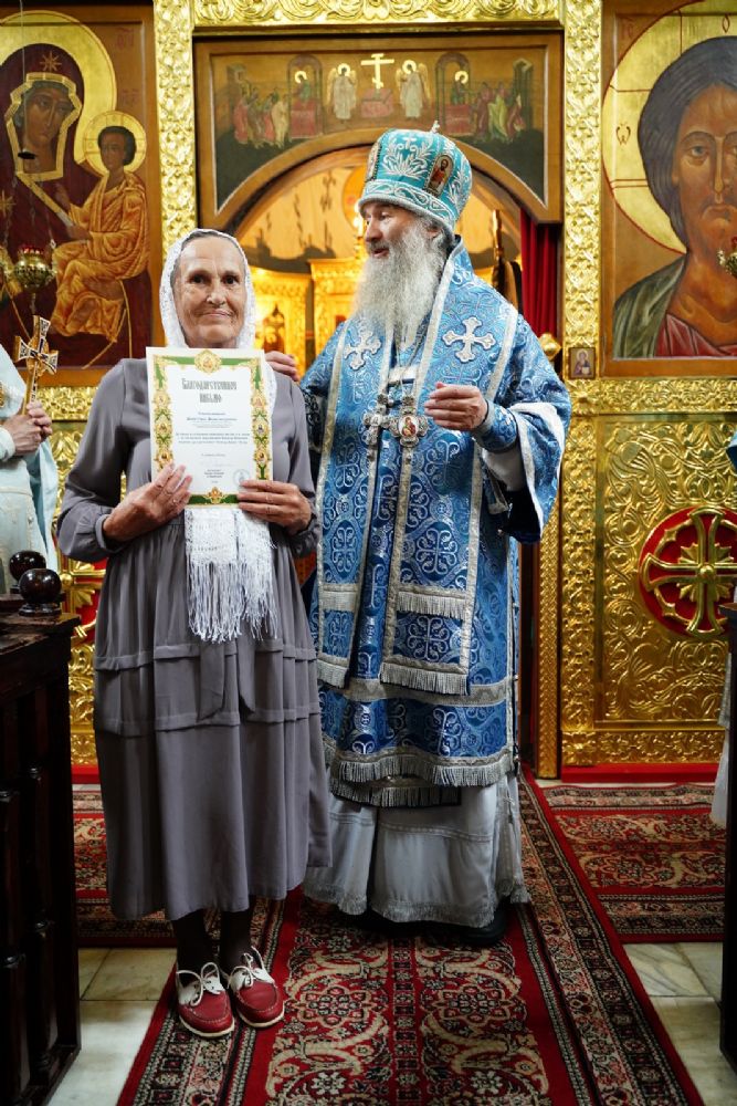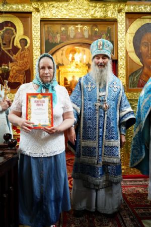 По возвращении в храм митрополит Иоанн вручил награды за вклад в созидание церковной жизни и в связи с 30-летием образования Йошкар-Олинской епархии: Щелчкова Галина Александровна и Задворных Алевтина Олеговна удостоились архиерейских грамот; Емельяновой Алевтине Александровне вручено благодарственное письмо за подписью правящего архиерея.