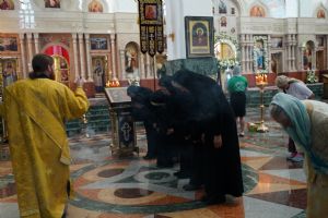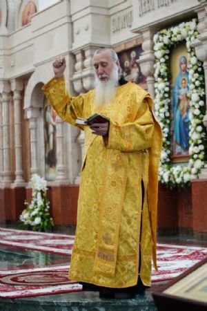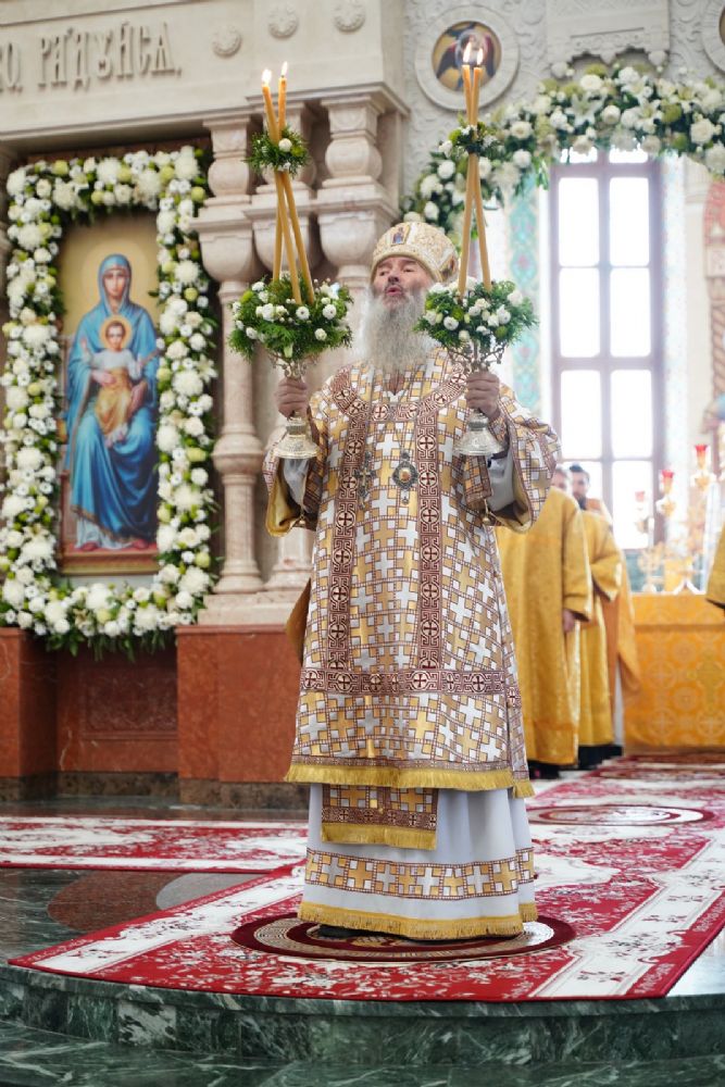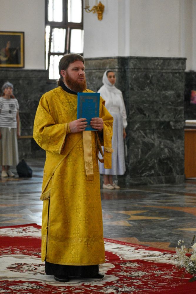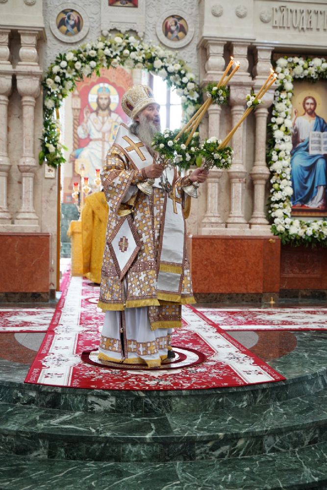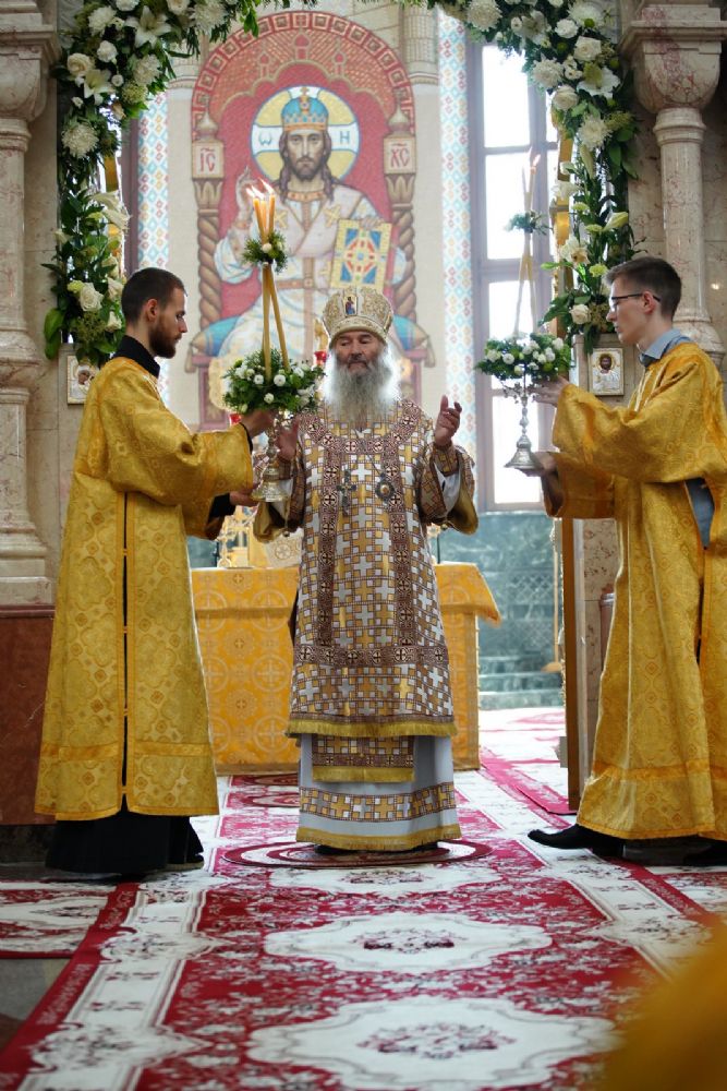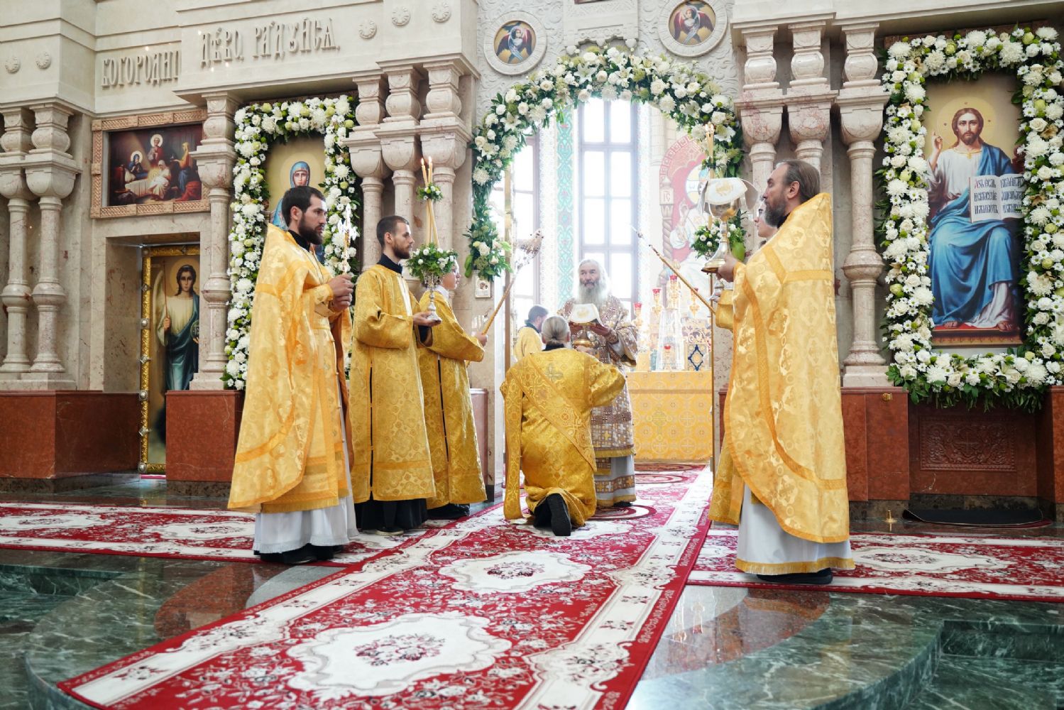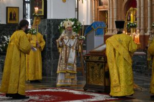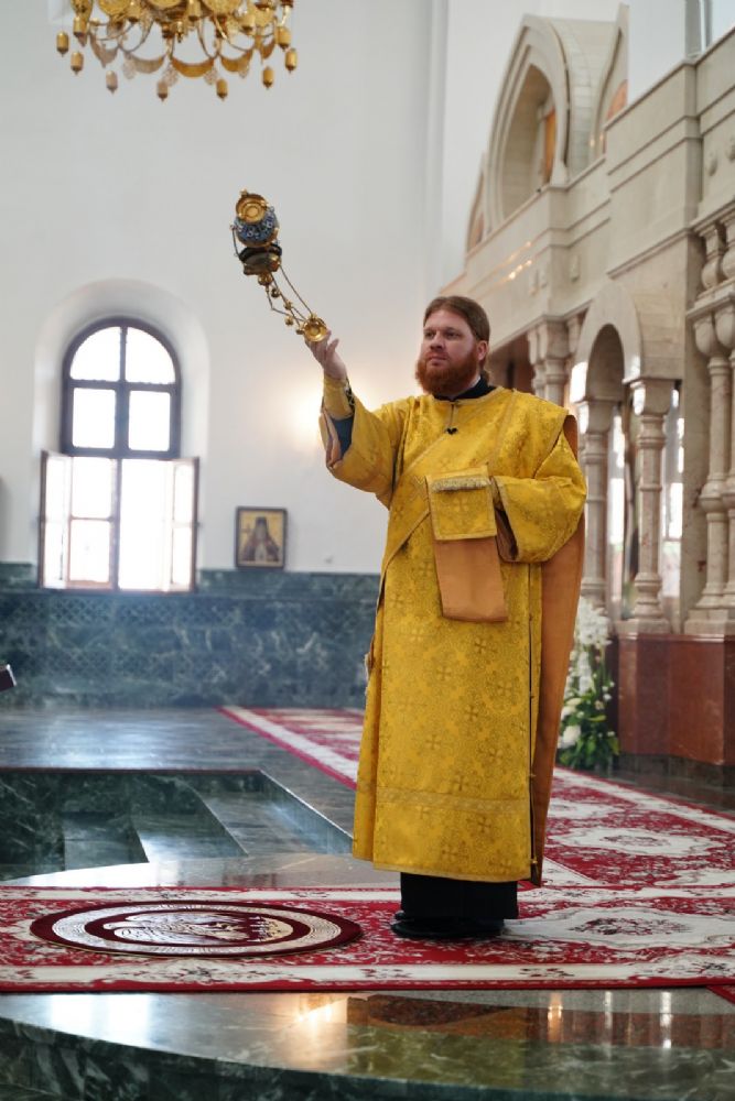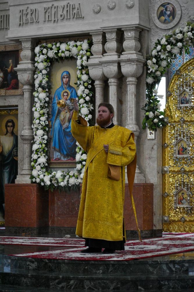 Архипастырю сослужили секретарь Йошкар-Олинского епархиального управления иеромонах Серафим (Пасанаев), клирики кафедрального собора иерей Евгений Самойлов, иерей Иоанн Милютин, диакон Андрей Дружинин и протодиакон Михаил Козловский. Песнопения исполнял хор «Благовест» под управлением Татьяны Черновой.