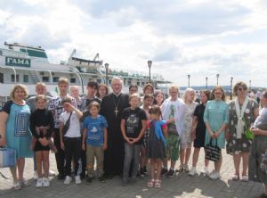 После молебна о путешествующих паломники вместе с настоятелем храма Архангела Михаила п. Юрино протоиереем Николаем Барсуковым и преподавателями воскресной школы на двух автобусах выехали к парому в Коротнях.