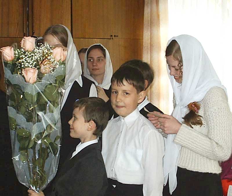 К окончанию 1 класса детям были приготовлены подарки: нарядные головки девочек были украшены белыми шарфиками, единственному же пока мальчику была преподнесена увлекательная книжка.