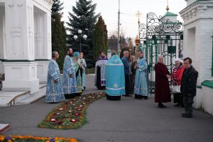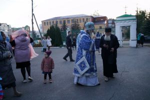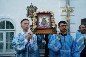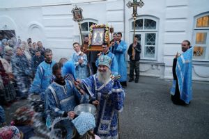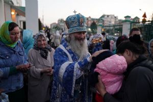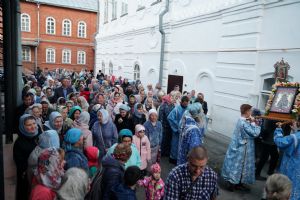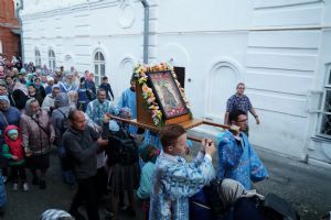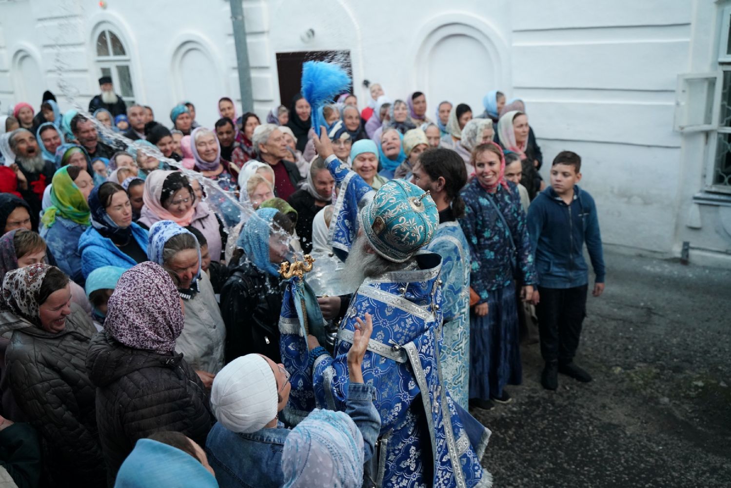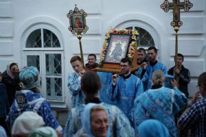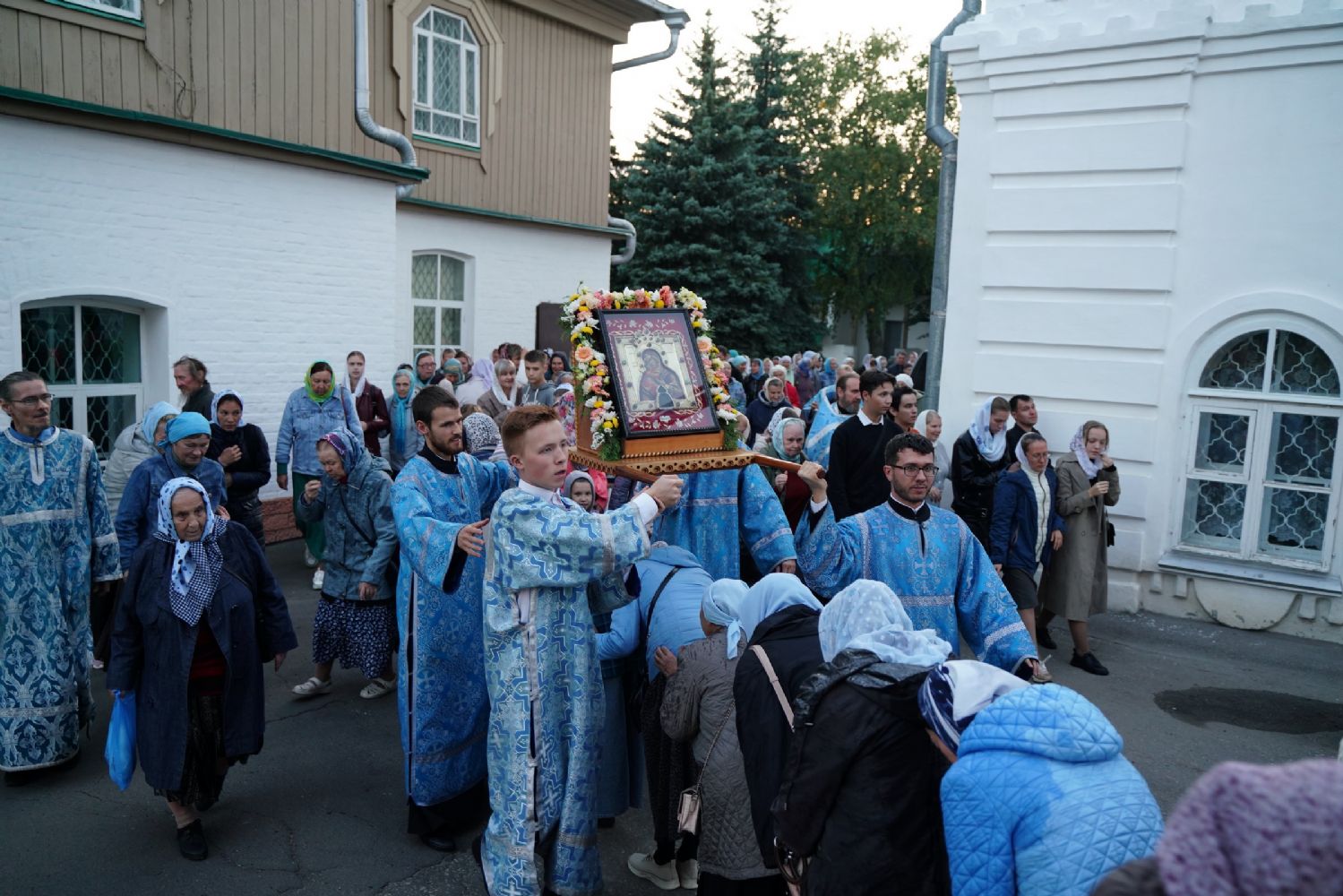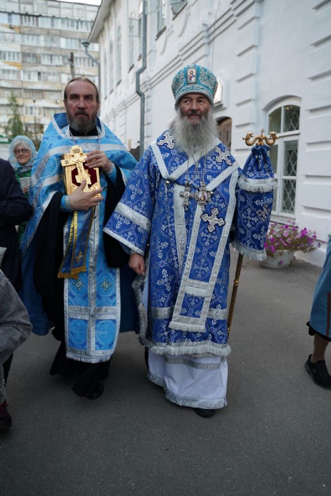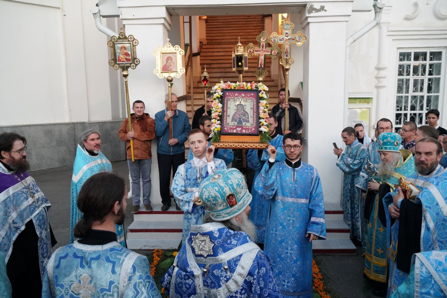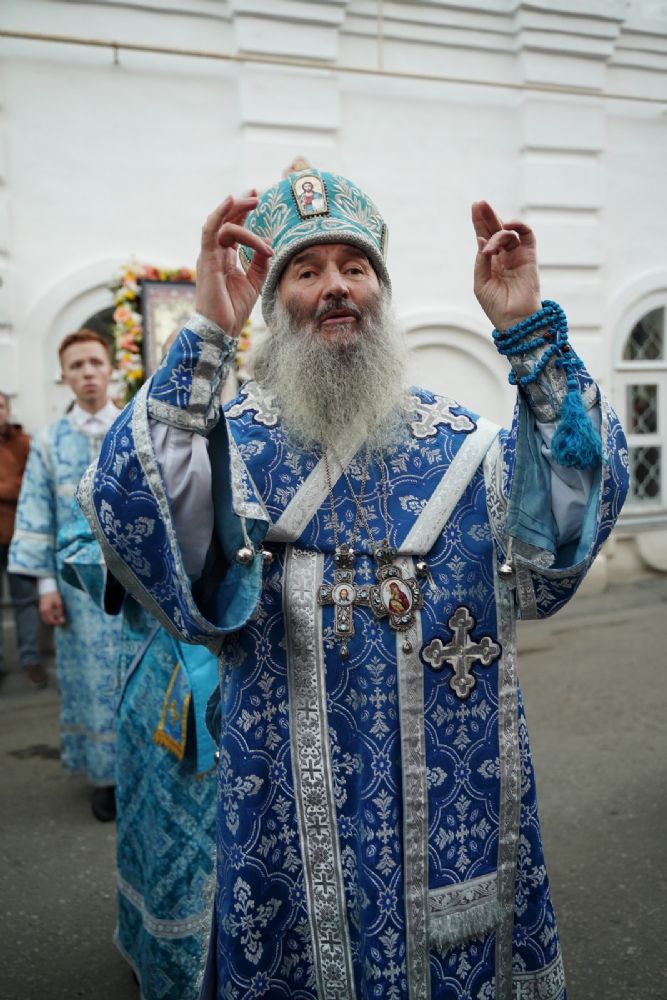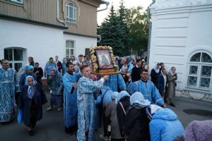 По окончании всенощного бдения крестный ход с Мироносицкой иконой Богородицы продолжился и, обойдя вокруг домового храма, отправился к Вознесенскому собору, где святыню встретили духовенство и прихожане собора.