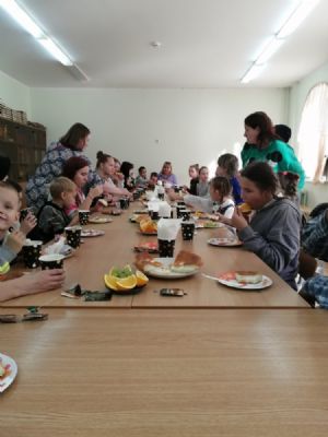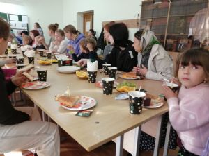 После совместной молитвы родители с детьми попили чай с пирогами и сладостями, ведь надо было набраться сил для предстоящего занятия по рисованию. На занятии дети раскрашивали фигурки русских воинов, которые педагог Мария Юрьевна Клюкина предусмотрительно нарисовала и вырезала заранее – что пришлось очень кстати, так как помимо старших детей, присутствовали и их младшие братья и сестренки. И детям было бы сложно самим нарисовать, а затем и раскрасить воинов.