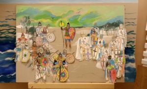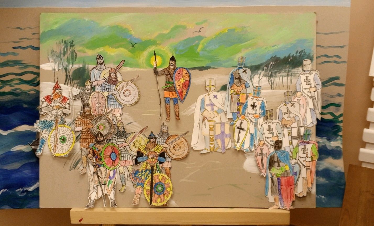 Занятие было увлекательным. Раскрашенных воинов наклеили на большой лист бумаги – в итоге появилась целая картина с Александром Невским – Солнцем земли Русской посередине. Ребятам очень понравилось быть художниками, все выразили желание прийти еще раз. Еще детей порадовали подарки в виде красивых вязаных игрушек, которые приности в социальный отдел одна добрая женщина. Эти игрушки неизменно вызывают восторг у ребят.