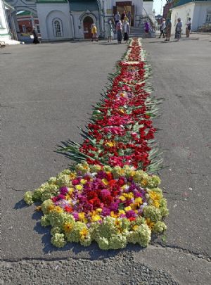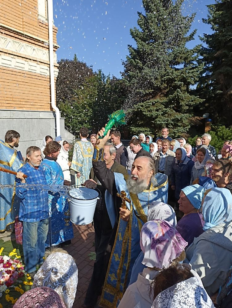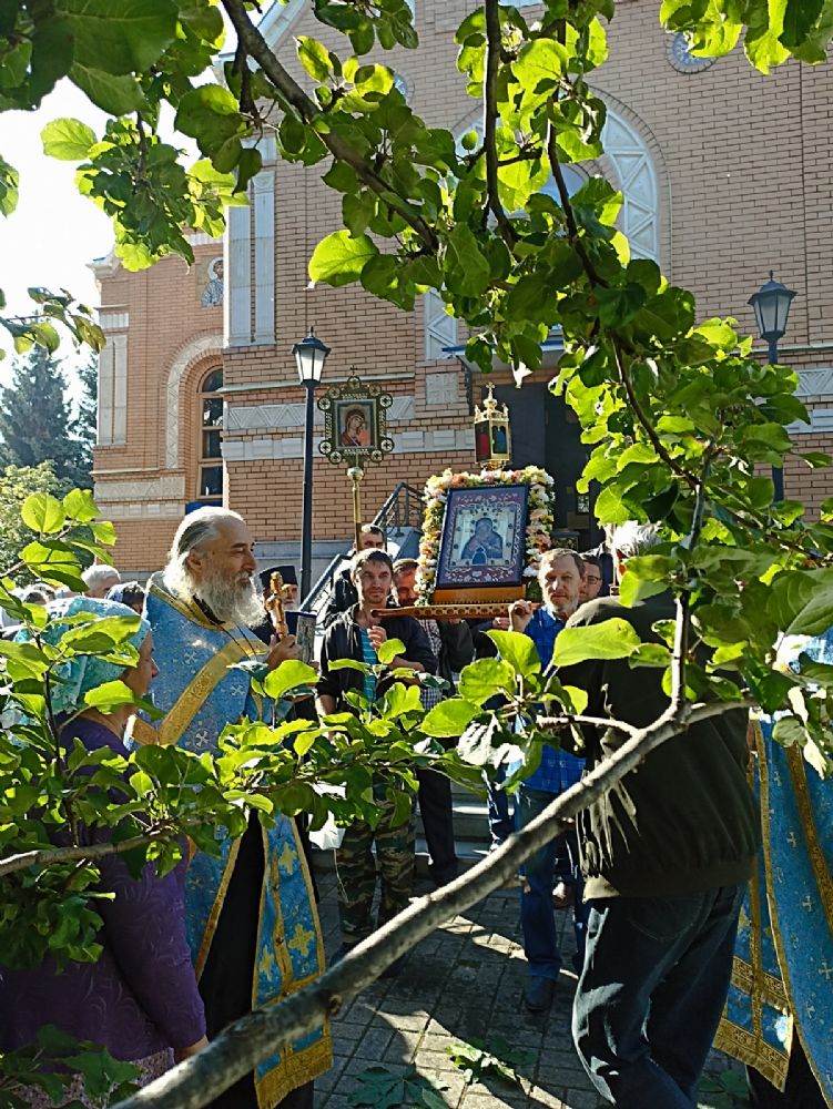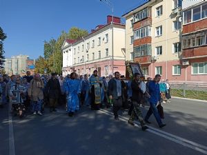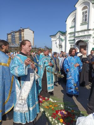 Верующих собралось много – вначале они во главе с настоятелем Успенского храма протоиереем Сергием Филоновым обошли вокруг храма со чтением Евангелия и кроплением святой водой. Далее с песнопениями и молитвами Пресвятой Богородице прошли по центральным улицам города к Троицкому храму.