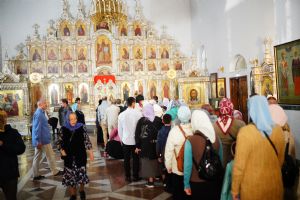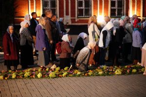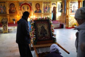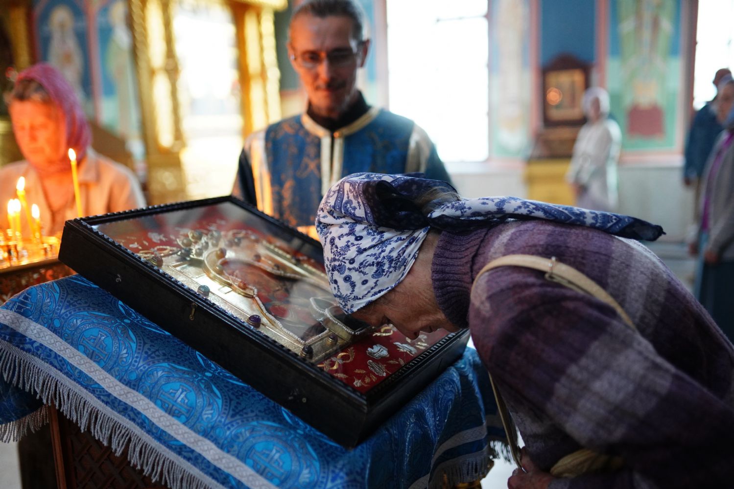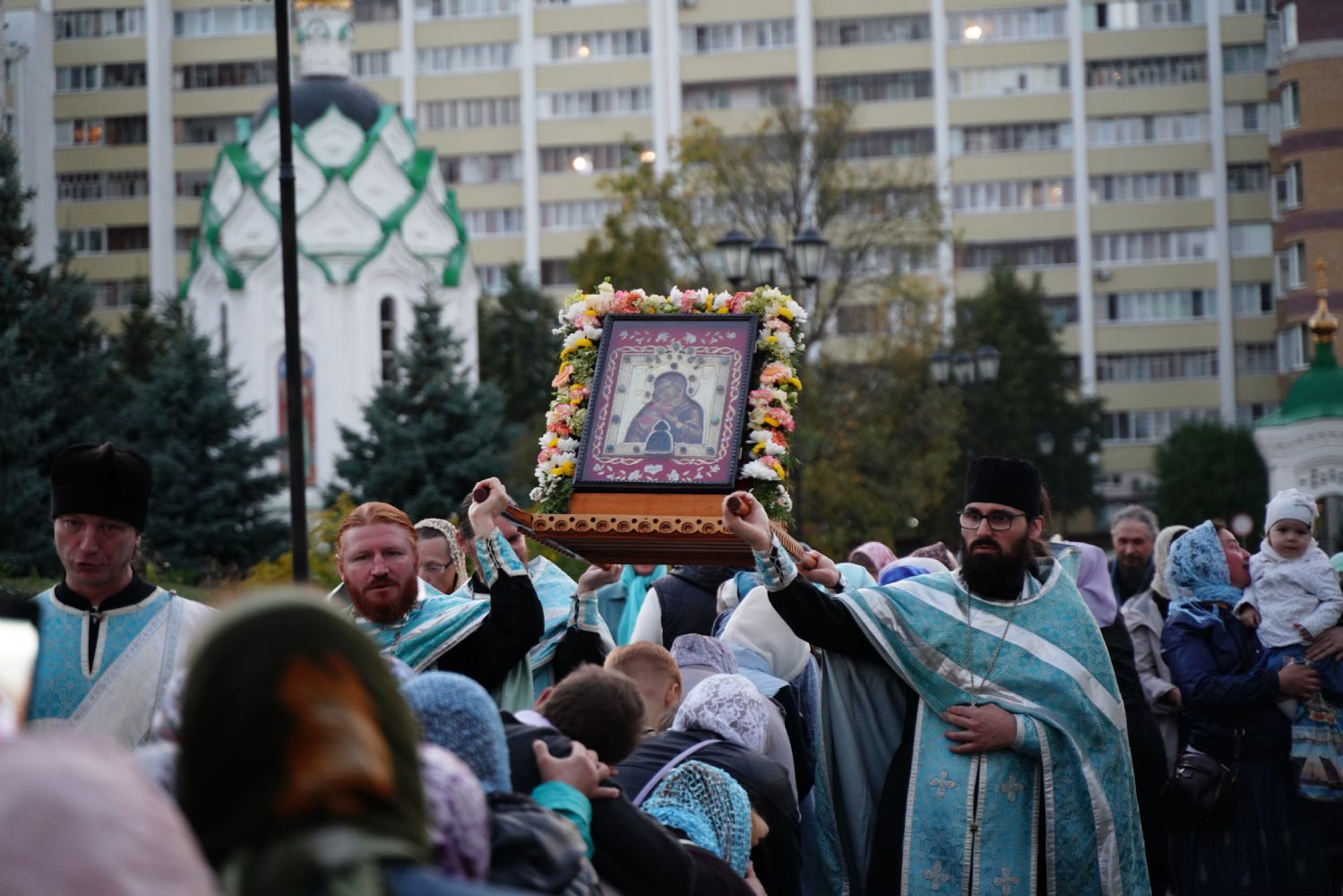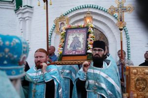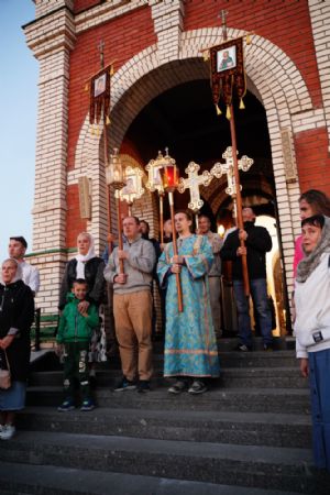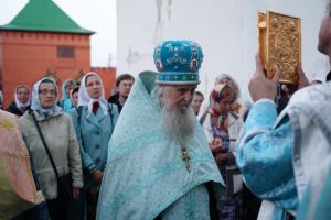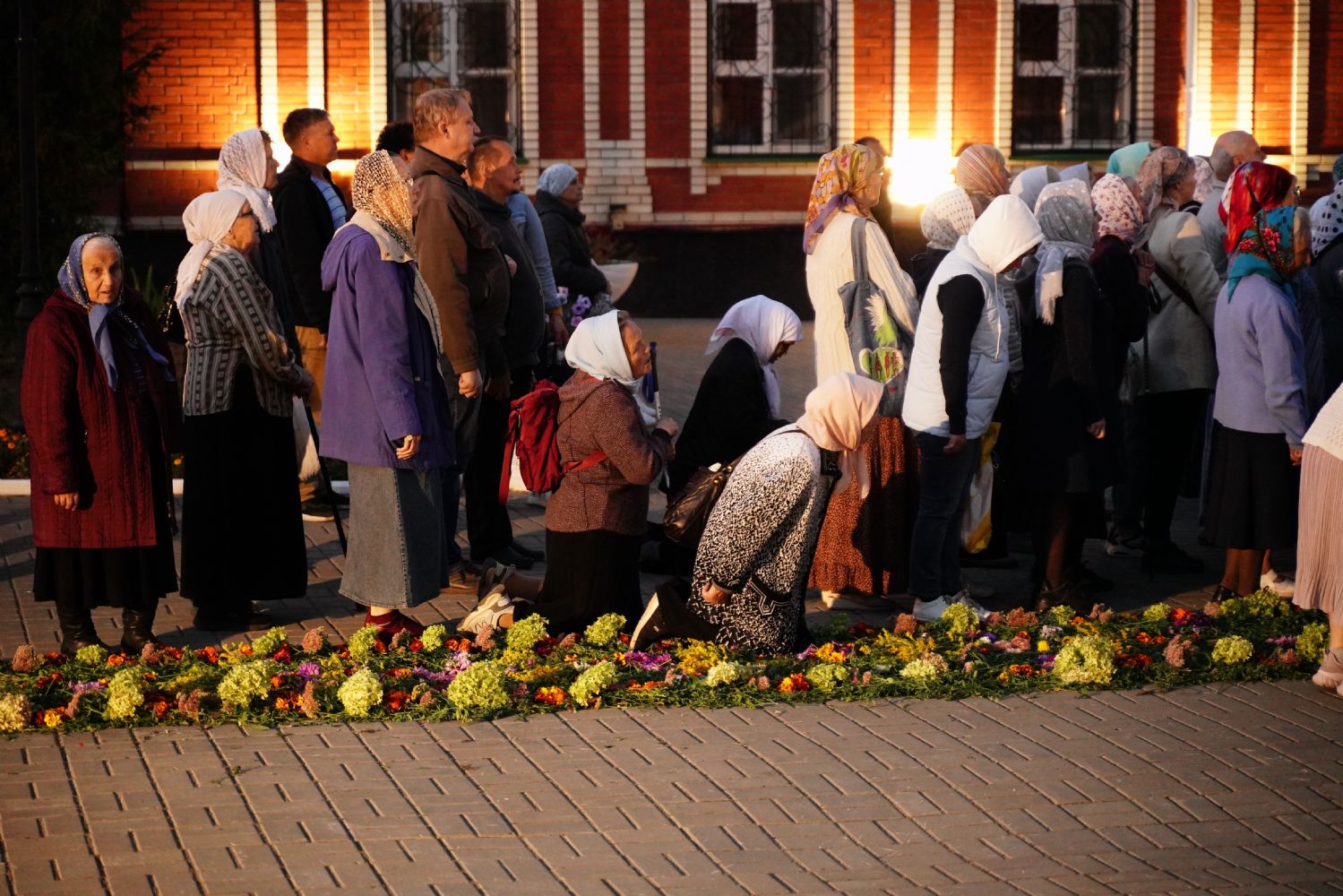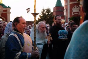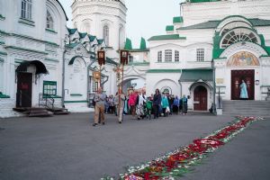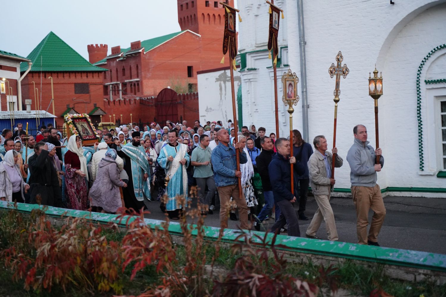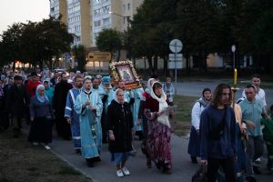 По окончании всенощного бдения прошел крестный ход вокруг храма со чтением Евангелия и кроплением святой водой, и далее крестоходцы двинулись к Воскресенскому собору города. Здесь Мироносицкую икону радостно встретили священство и прихожане собора. Верующие все вместе вознесли молитву ко Пречистой, пропели величание, благоговейно приложились к святыне.
