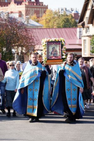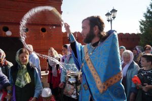 Утром 16 сентября в Воскресенском соборе г. Йошкар-Олы, где накануне вечером встретили Мироносицкий крестный ход, была совершена Божественная литургия, возглавил которую настоятель собора иерей Алексий Кирюшкин.