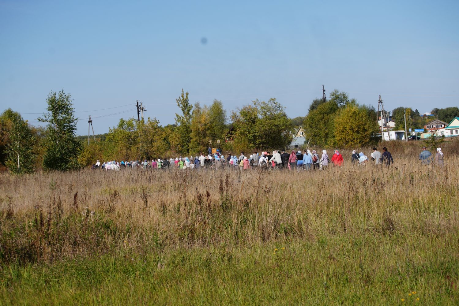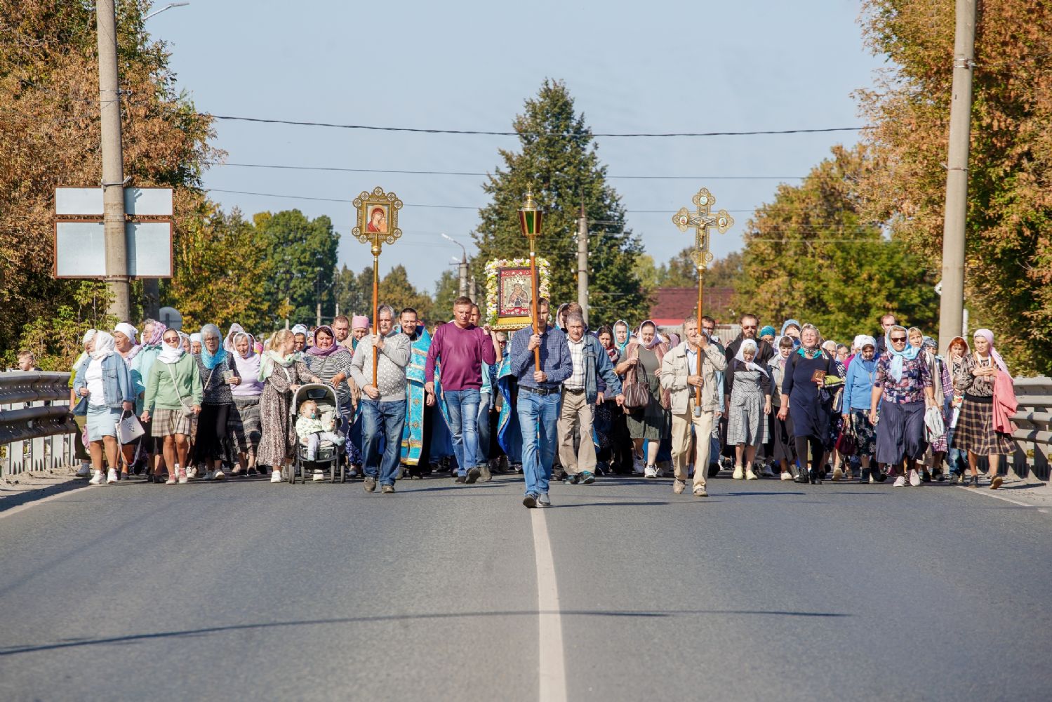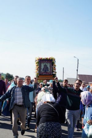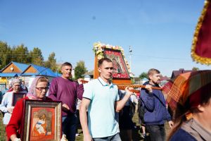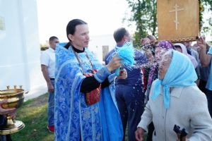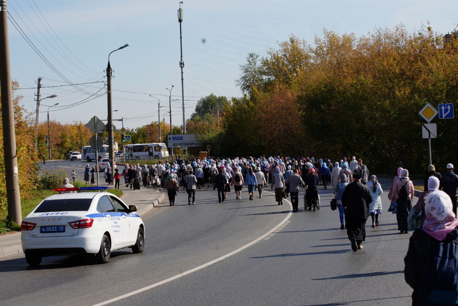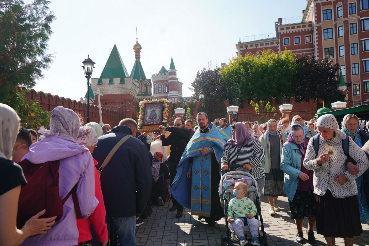 После Литургии был совершен крестный ход вокруг собора с чтением Евангелия и кроплением святой водой. И затем Мироносицкая икона Божией Матери под звон колоколов в сопровождении священства и прихожан отправилась в дальнейший путь – за пределы Йошкар-Олы, в село Кузнецово Медведевского района. К молитвенному шествию присоединялись жители селений, лежащих на пути следования святыни.