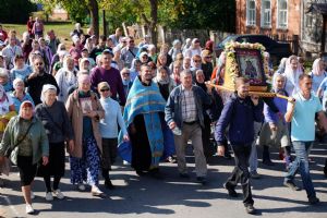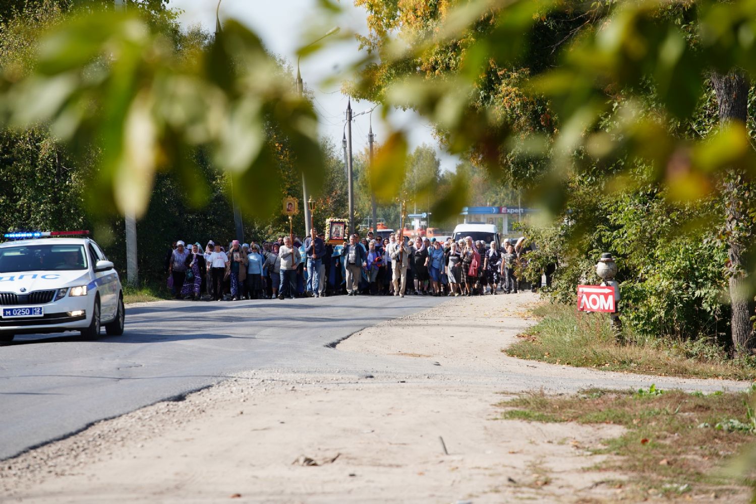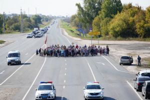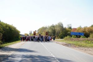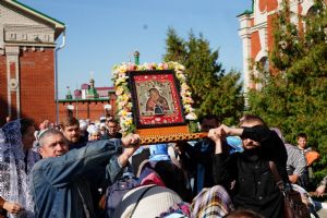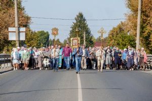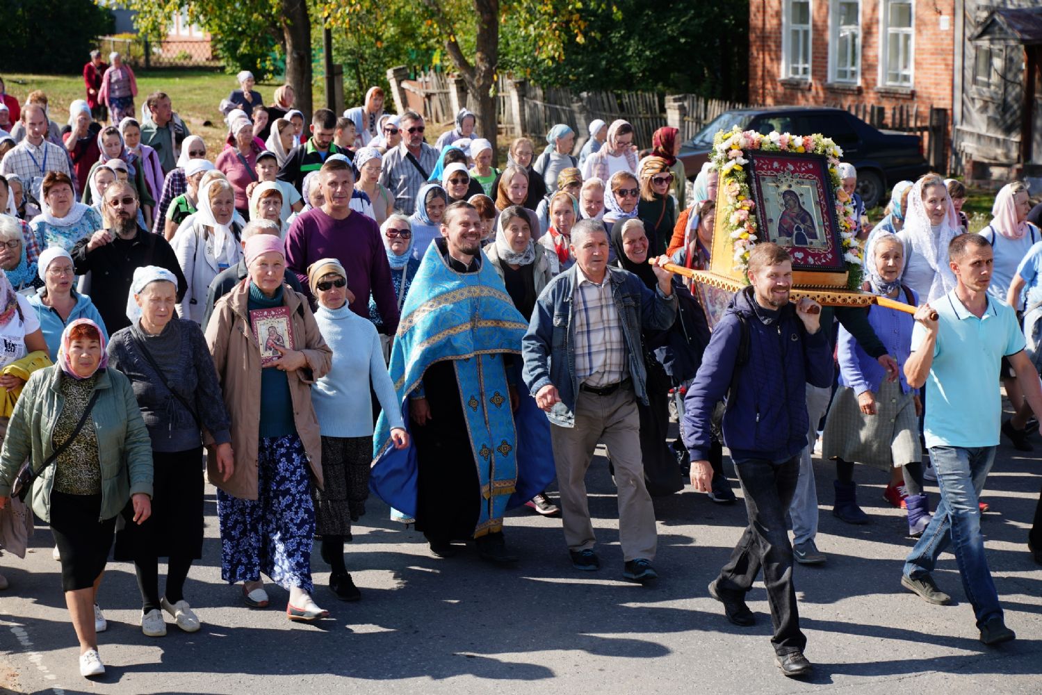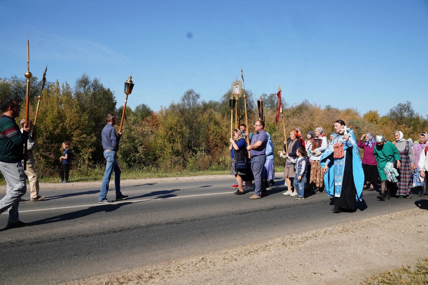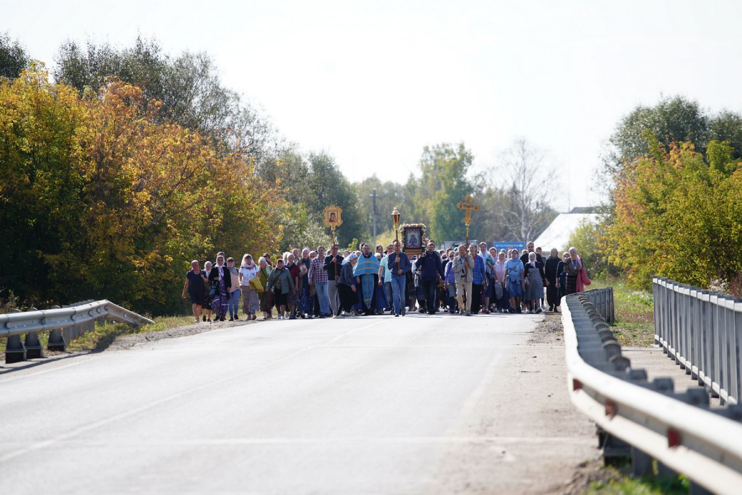 После Литургии был совершен крестный ход вокруг собора с чтением Евангелия и кроплением святой водой. И затем Мироносицкая икона Божией Матери под звон колоколов в сопровождении священства и прихожан отправилась в дальнейший путь – за пределы Йошкар-Олы, в село Кузнецово Медведевского района. К молитвенному шествию присоединялись жители селений, лежащих на пути следования святыни.