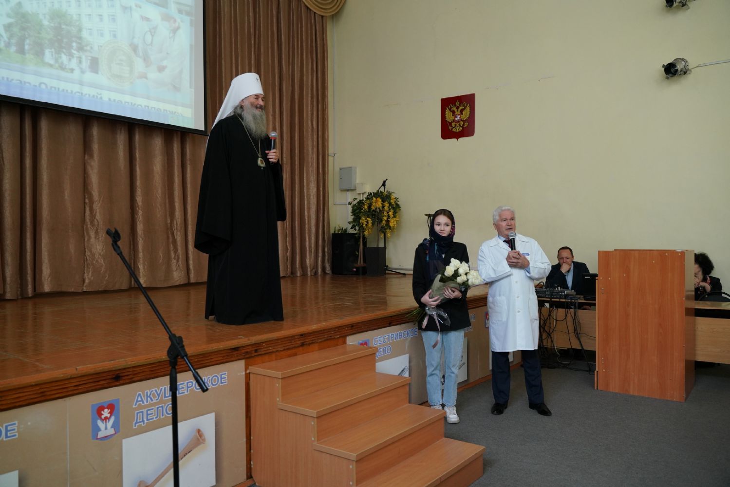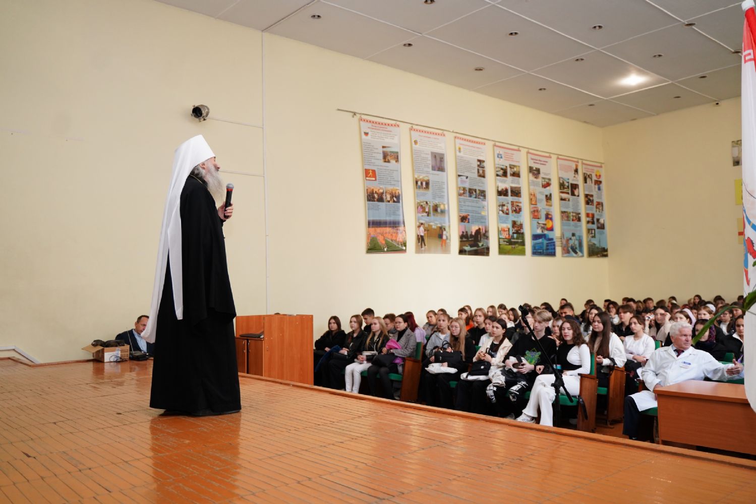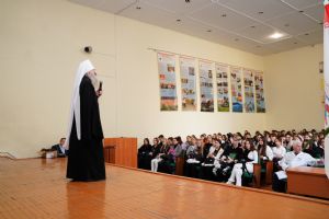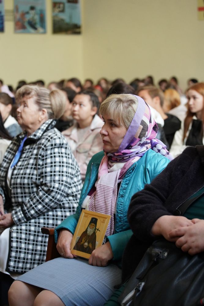 После молебна митрополит Иоанн в актовом зале медколледжа побеседовал со студентами и педагогами, рассказав о жертвенном жизненном пути святителя и исповедника Луки – профессора медицины и архиепископа. Владыка пожелал ребятам брать с него пример в служении людям и верности Богу и не забывать молиться святителю: «…чтобы он вас умудрил, научил быть истинными служителями милости Божьей, дал вам всем духа премудрости, духа разума, духа страха Божия, чтобы в своих поступках вы никогда не переступали грань дозволенного. Ваша юношеская жизненная энергия должна быть направлена не на буйство и вседозволенность, а прежде всего на приобретение знаний и на доброе отношение друг другу и к окружающим. Вам необходимо учиться владеть своими чувствами, отсекать эгоизм и лень, правильно распоряжаться своим временем и, начиная день с молитвы, дорожить каждым мгновением. И помнить – Господь дает вам возможность реализоваться при одном условии: если вы будите к себе строги, а к другим снисходительны».