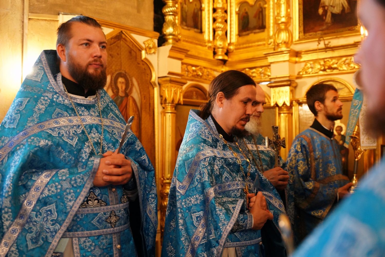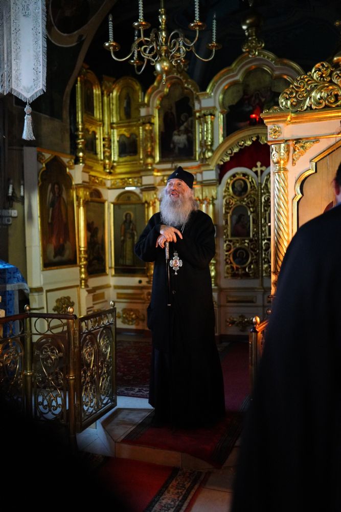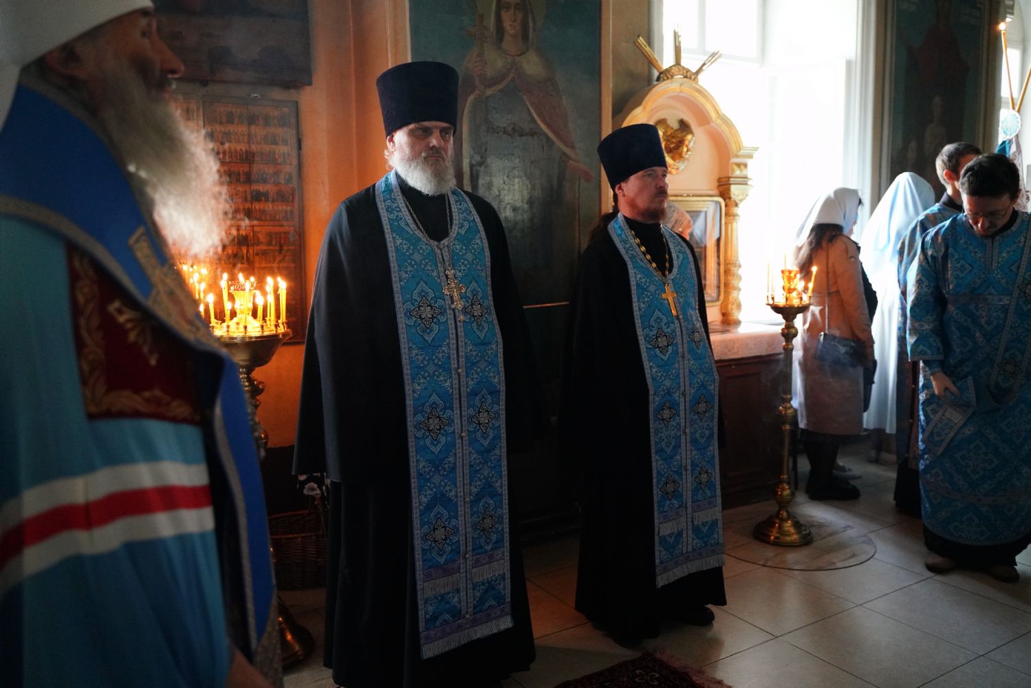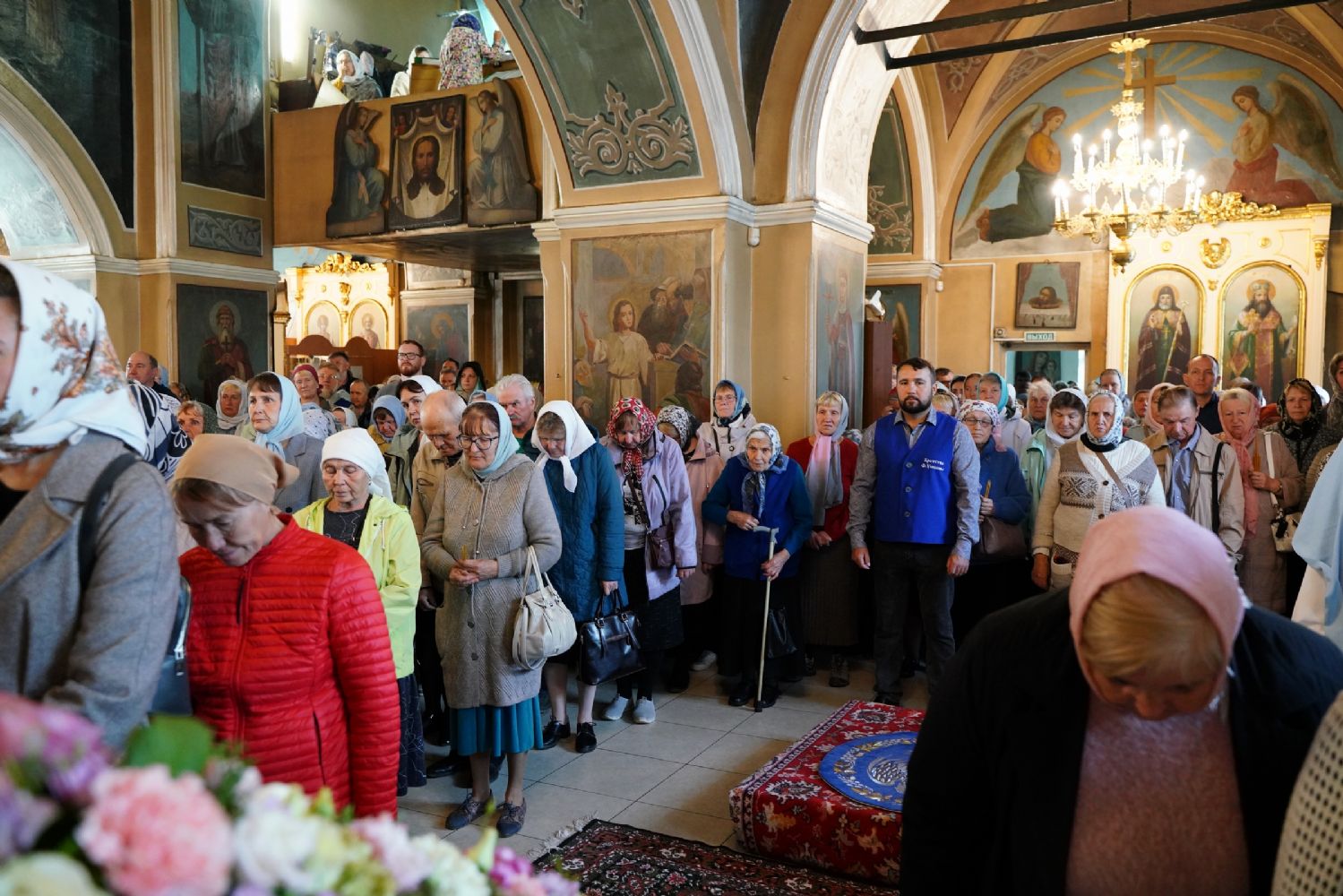 Его Высокопреосвященству сослужили ключарь храма протоиерей Михаил Ильин и клирики храма. Песнопения исполнял хор храма. За богослужением помогали Православные добровольцы и члены братства святого праведного Феодора Ушакова.