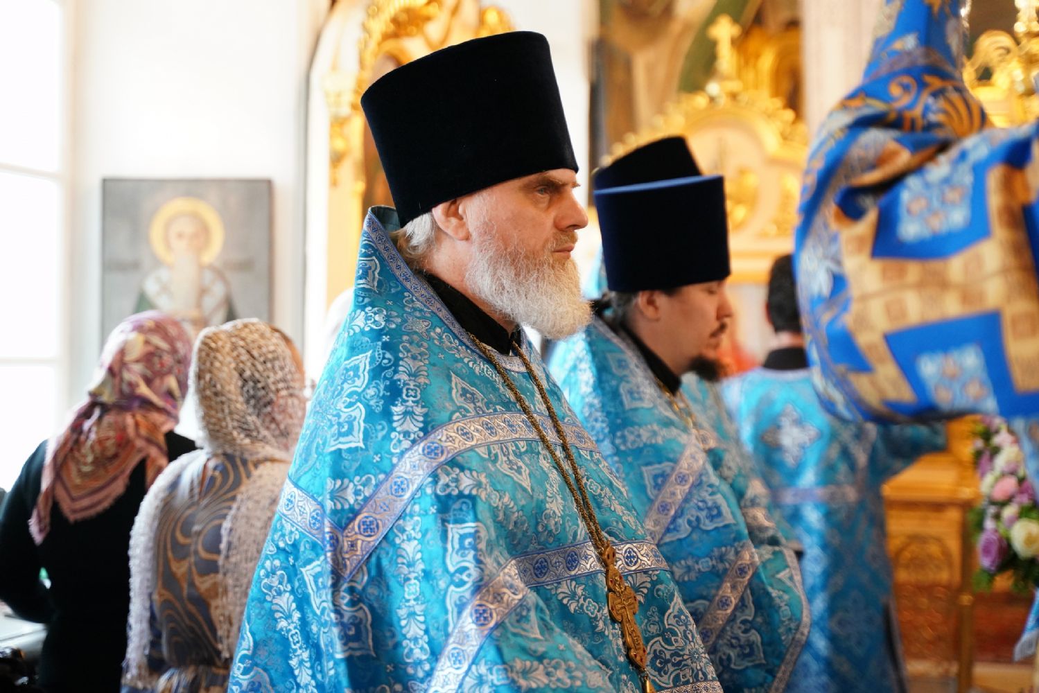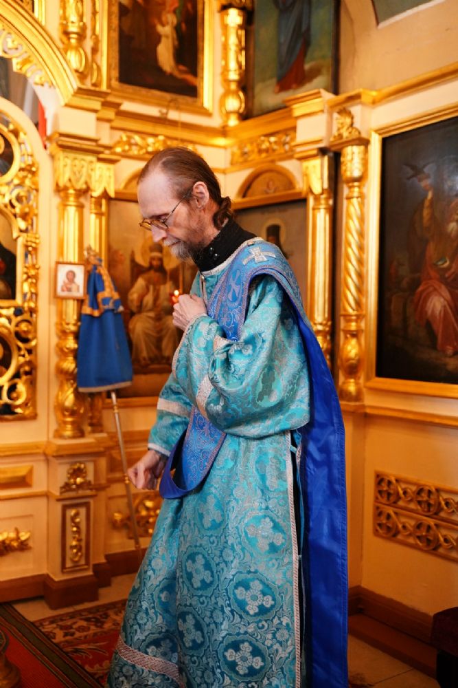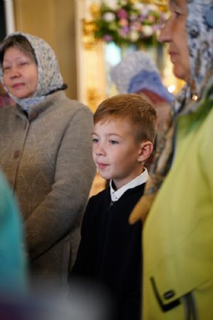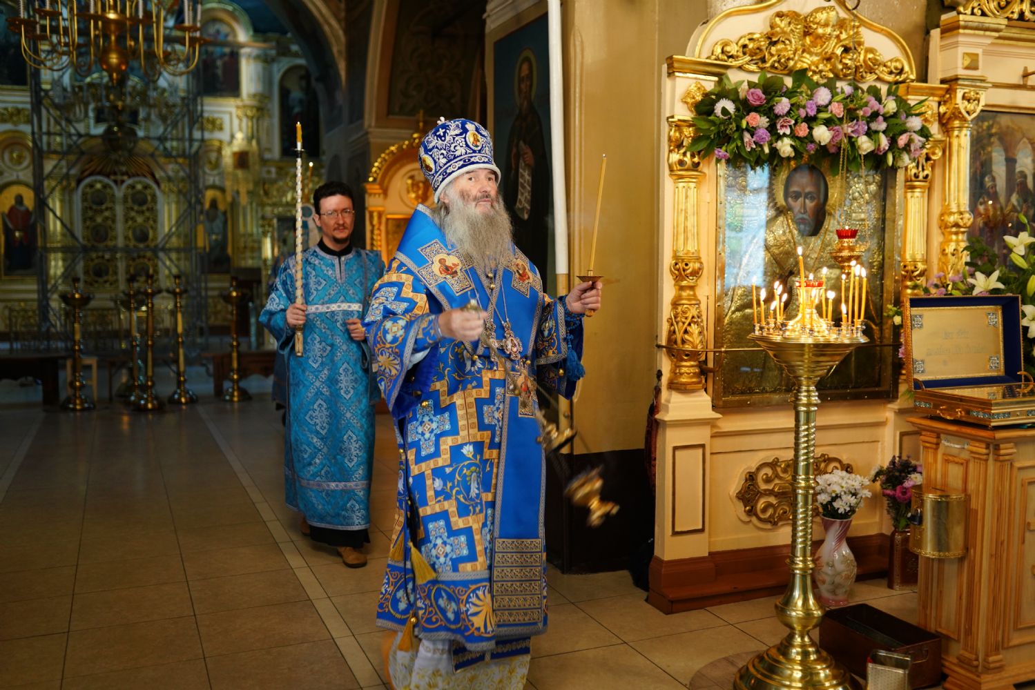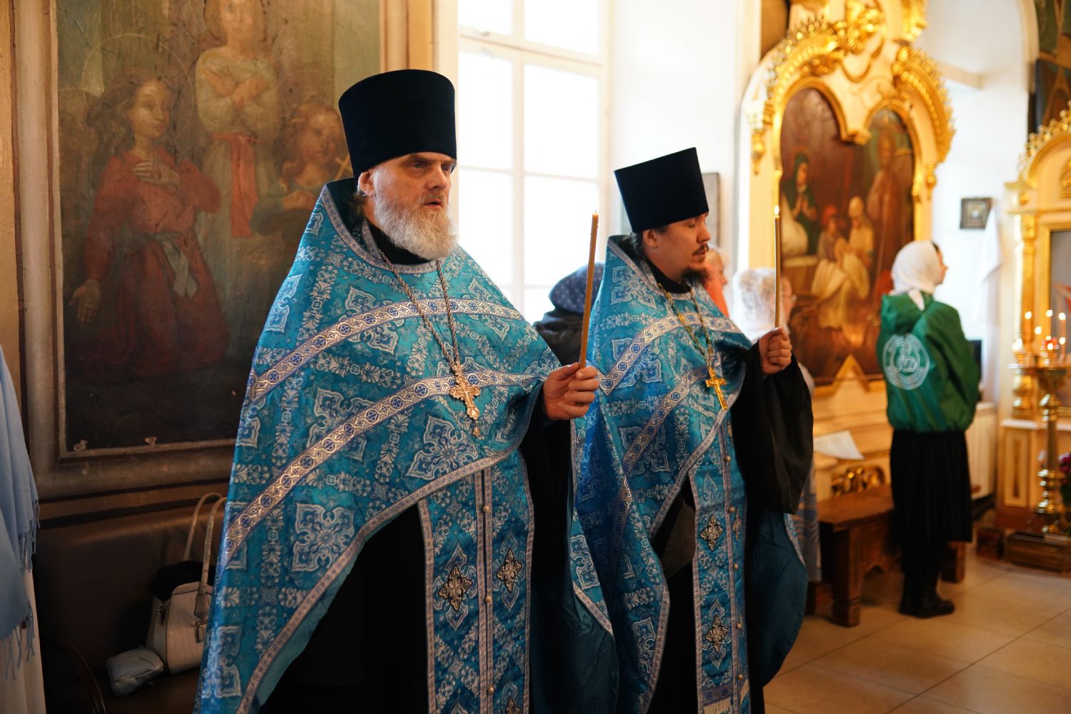 Его Высокопреосвященству сослужили ключарь храма протоиерей Михаил Ильин и клирики храма. Песнопения исполнял хор храма. За богослужением помогали Православные добровольцы и члены братства святого праведного Феодора Ушакова.