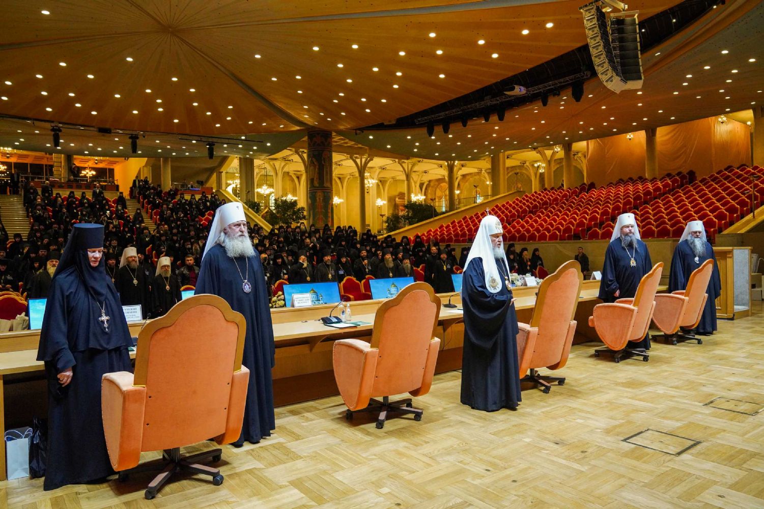 Места в президиуме заседания заняли: Святейший Патриарх Московский и всея Руси Кирилл; управляющий делами Московской Патриархии, наместник Новоспасского ставропигиального мужского монастыря г. Москвы митрополит Воскресенский Дионисий; митрополит Каширский Феогност; митрополит Нижегородский и Арзамасский Георгий; заместитель председателя Синодального отдела по монастырям и монашеству, настоятельница Зачатьевского ставропигиального женского монастыря г. Москвы игумения Иулиания (Каледа).