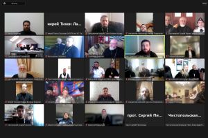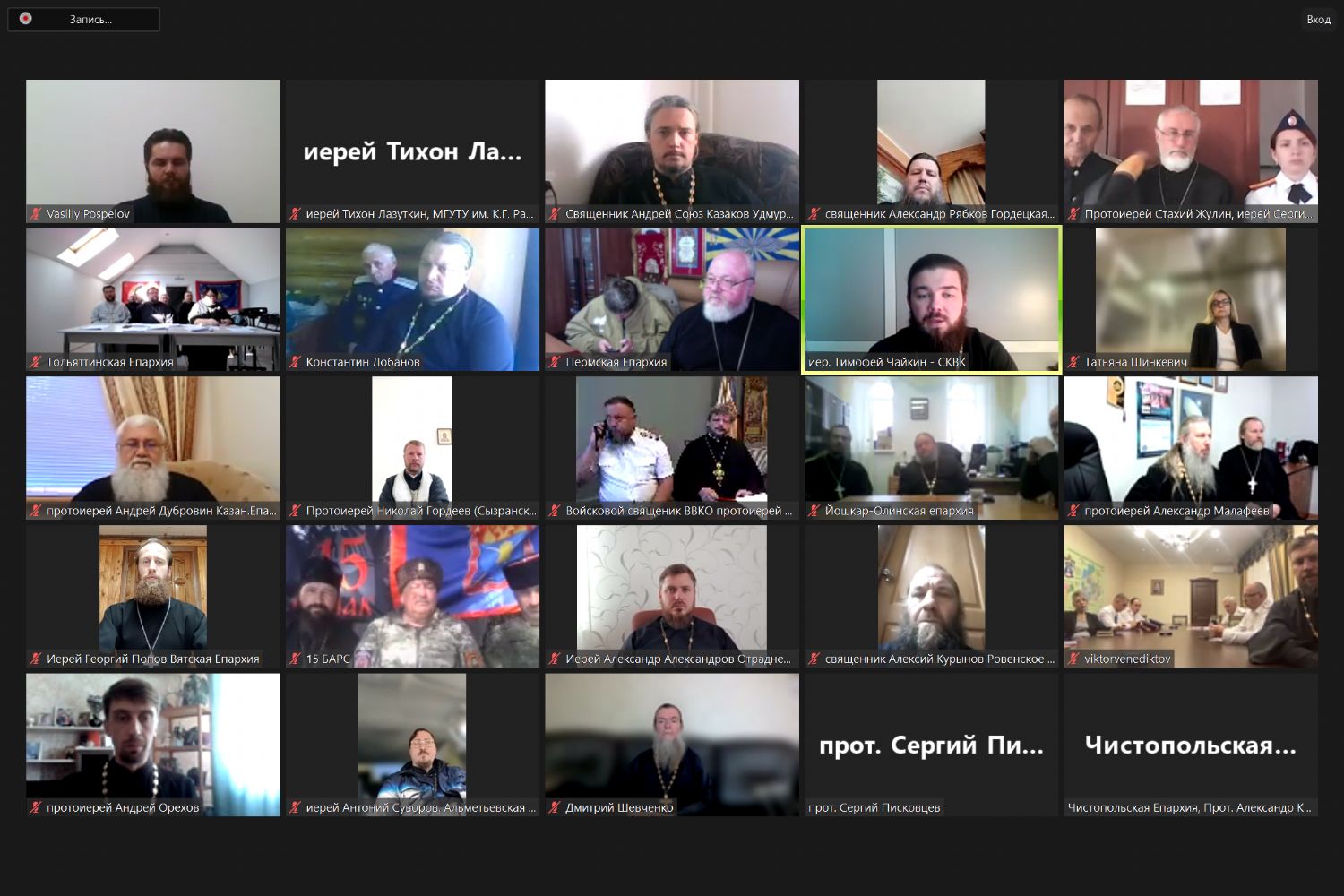 Видеосовещание возглавил ответственный секретарь Синодального комитета по взаимодействию с казачеством иерей Тимофей Чайкин. Участие приняли 80 человек, среди которых референт Управления Президента РФ по вопросам государственной службы, кадров и противодействия коррупции, ответственный секретарь Совета при Президенте РФ по делам казачества Алексей Кириченко, войсковой атаман ВВКО Юрий Иванов, войсковой священник ВВКО протоиерей Сергий Нестеров, сотрудники Синодального комитета, руководители епархиальных отделов по взаимодействию с казачеством, отдельские атаманы, казаки и казачки.